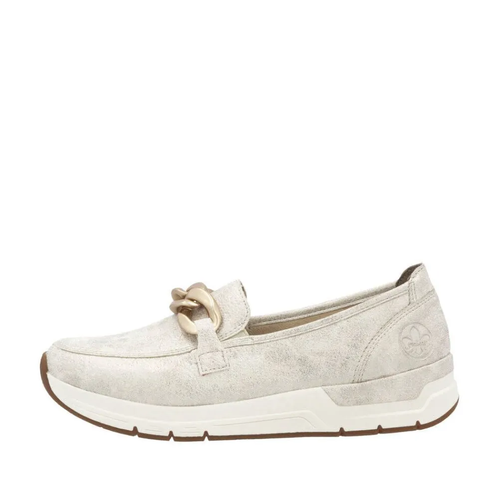 Naisten vaaleat kävelykengät kultaisella ketjukoristeella. Jalkineen sivuilla pukemista helpottavat venykkeet. Pehmust…
