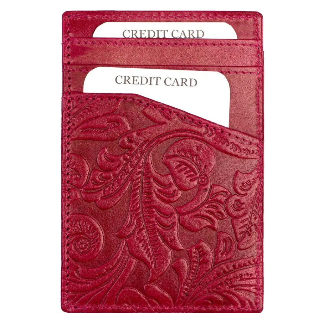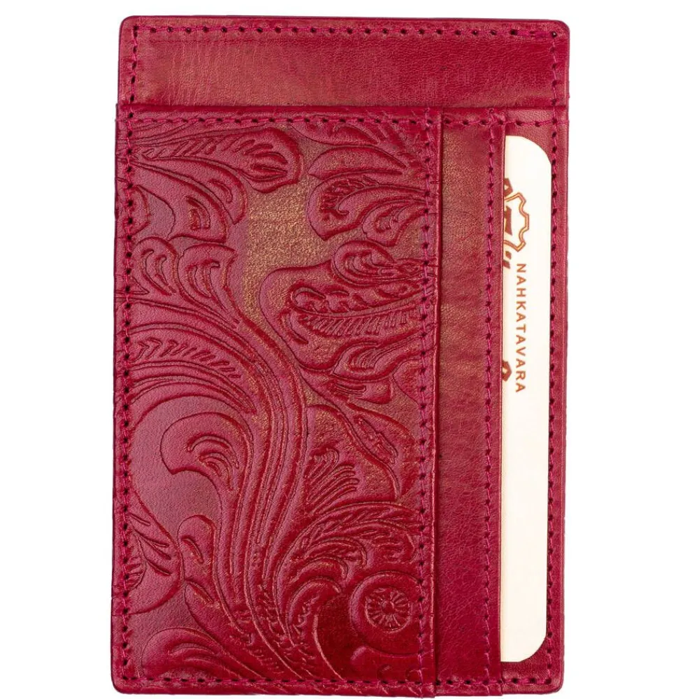 Kaunis koristekuvioitu RFID-suojattu nahkainen korttikotelo. Molemmin puolin kolme korttipaikkaa ja välissä tila esime…