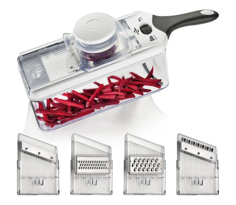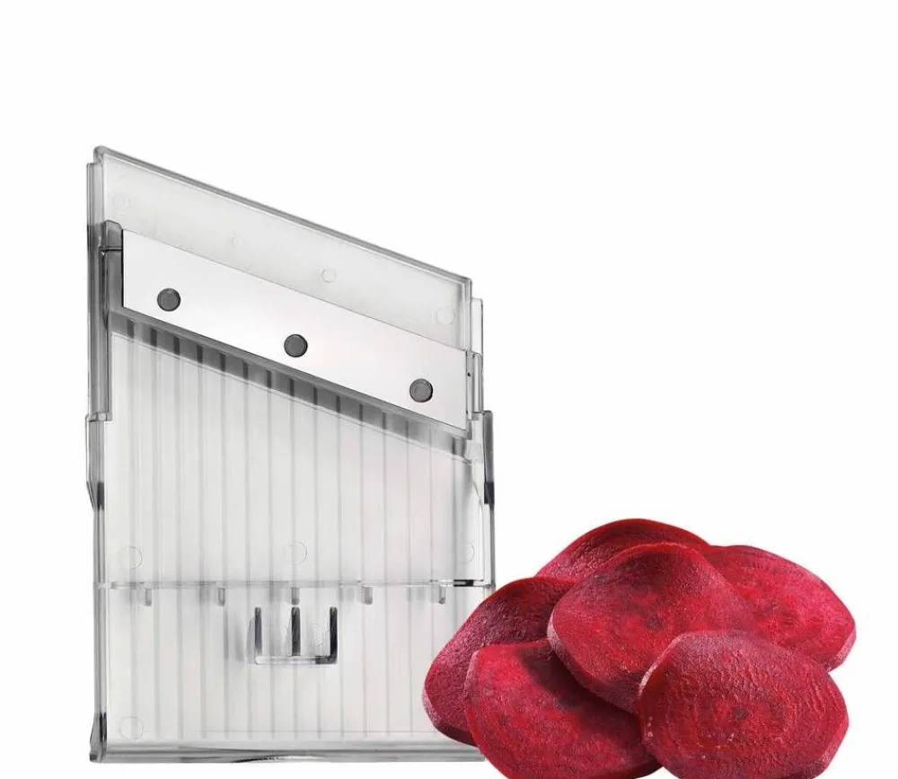 | Käyttöohjeet: Irrottaaksesi leikkuuterä varmista ensin, että terän korkeudensäädin on ääriasennossa oikealla. Nosta ja liuta terä mandoliinin suuntaisesti kahvasta kiinni pitäen. Liuta haluamasi terä paikalleen kunnes kuulet kiinnityspainikkeen naksahtavan HUOM! Leikkausterä on erittäin terävä. Varo leikkaamasta käsiäsi vaihtaessasi teriä. Suikale- ja viipaleterää käytettäessä terän korkeus on säädettävissä 1 mm -5 mm välillä. Turvallisen työskentelyn takaamiseksi käytä käsisuojainta aina, varsinkin pienien ruokapalojen kanssa. Aseta leikkuuterän omaava runko keräysastian päälle ja viipaloi/suikaloi/raasta haluamasi ruoka-aineet painaen kevyesti ja liuttaen tasaisesti edestakaisin. Vinkki: Leikkaa isot ruokapalat puoliksi tai neljään osaan, ennen käsisuojaan kiinnittämistä. |