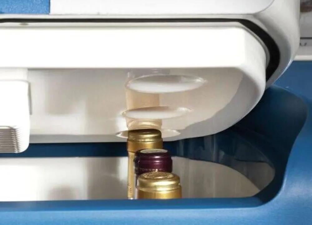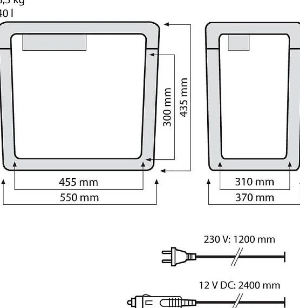 | Kiinteästi asennetut johdot DC/12 V ja AC/230 V tilavassa säilytyslokerossa. Pakkauksessa mukana varasulake 8 A autopistoketta varten. Pese sisäosa: nesteenpoistoa varten pohjassa on tulppa. |