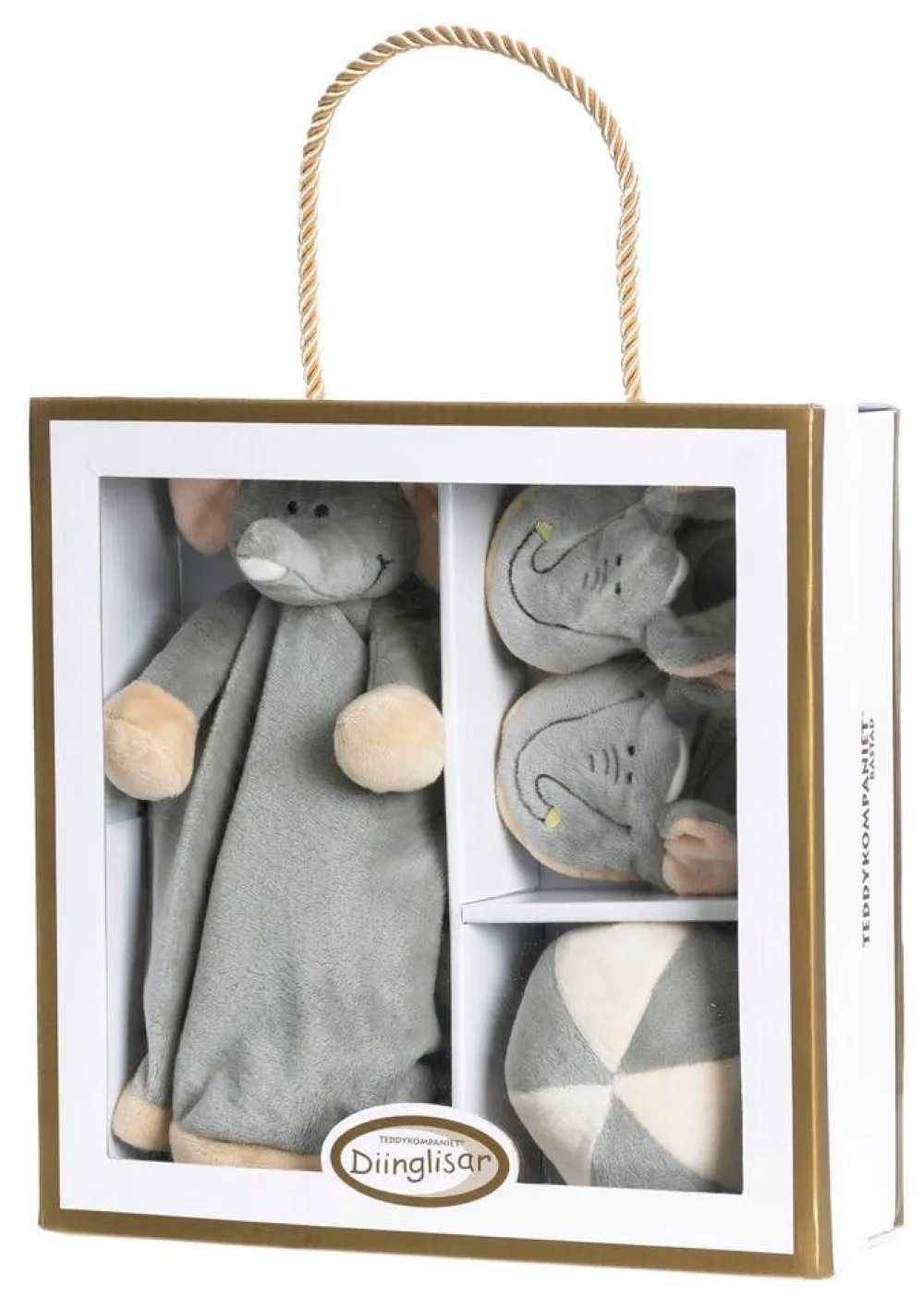 Kaunis harmaa lahjapakkaus vauvalle sisältää suositun Diinglisar-unirievun, pienet tossut ja helisevän pehmopallon. …