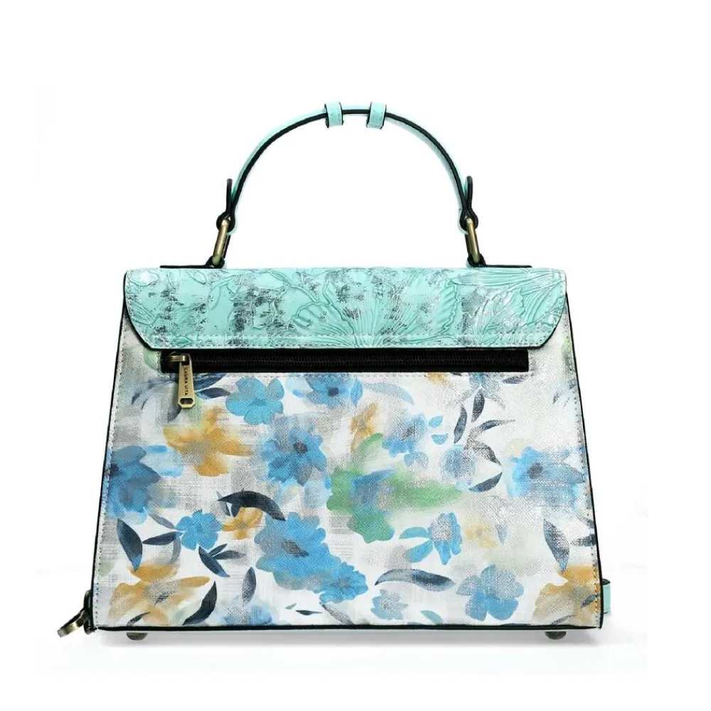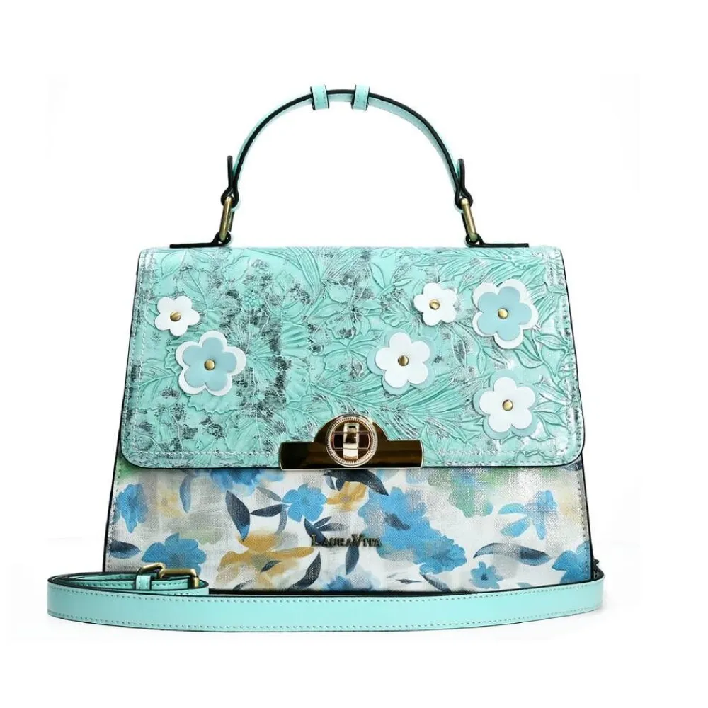 Tunnistettavan värikäs Laura Vita laukku uniikilla muotoilulla. Tähän malliin kuuluu irrotettava olkahihna ja käsik…