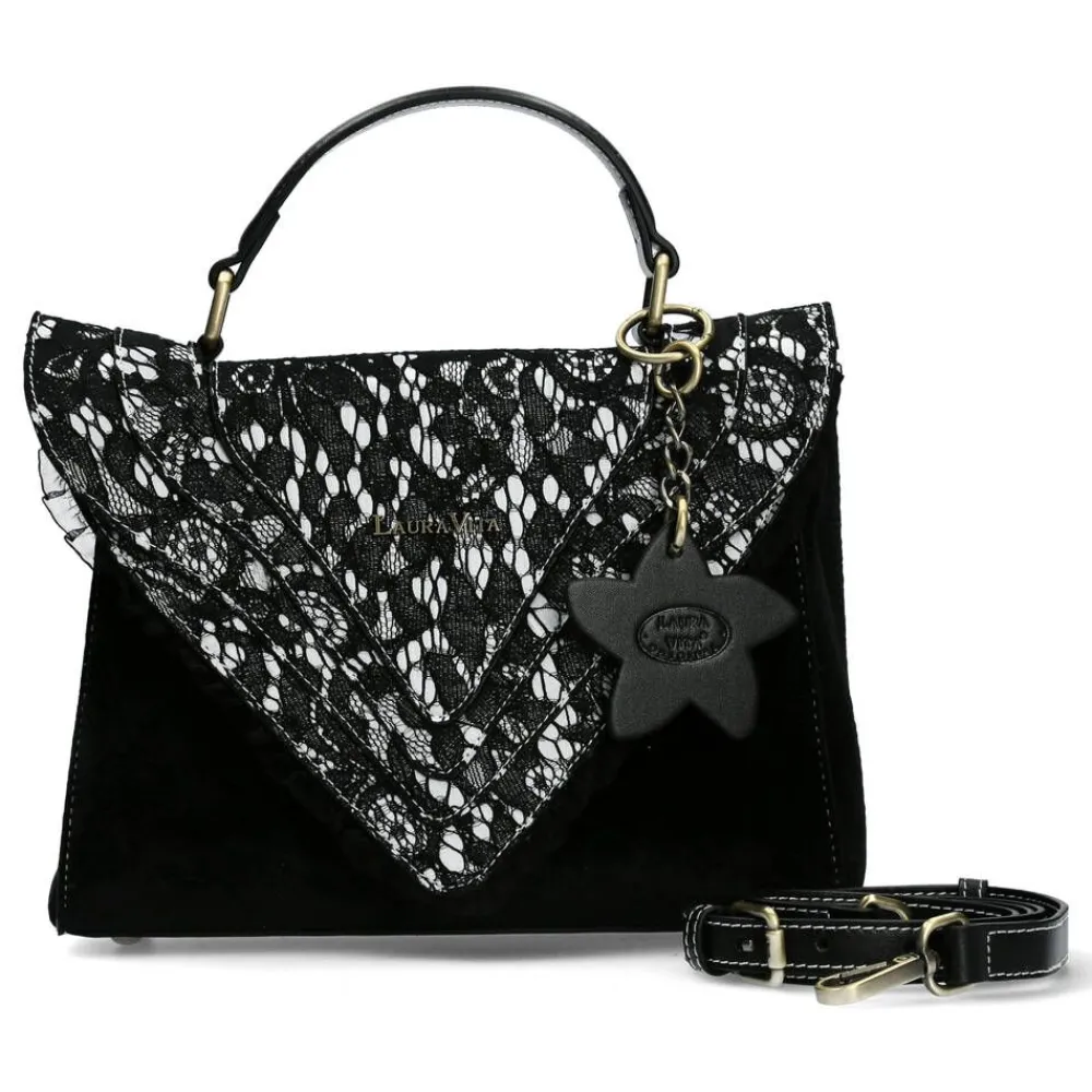 Näyttävä pitsikoristeltu nahkapintainen laukku, jossa on magneettilukko, vetoketju, säädettävä olkahihna ja käsi…