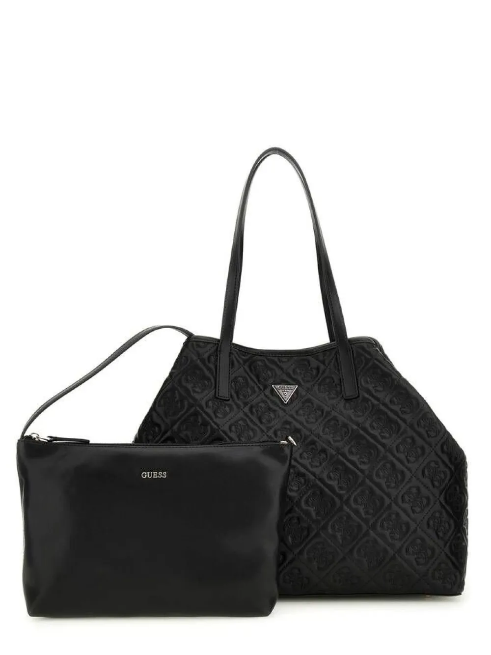 Klassisen tyylikäs nahkajäljitelty tilava laukku metallisella kolmiologolla ja pitkillä käsikahvoilla. Mukana tulee …