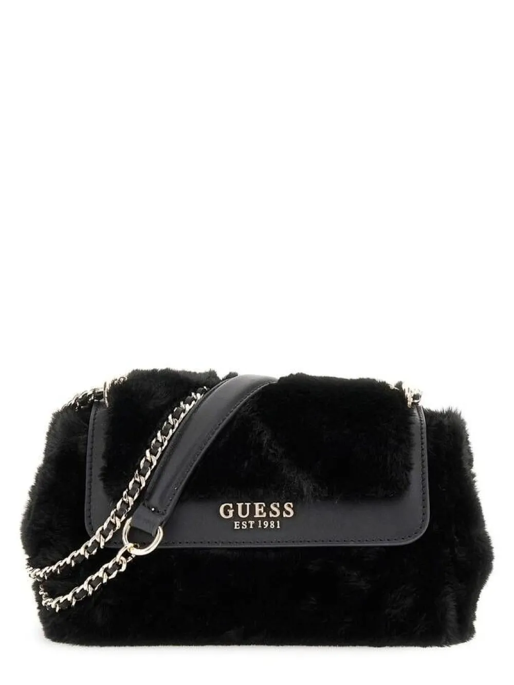 Trendikäs karvapintainen muhkea olkalaukku. Läpässä on painonappi ja olkahihnassa osittaista kullan väristä ketjua…