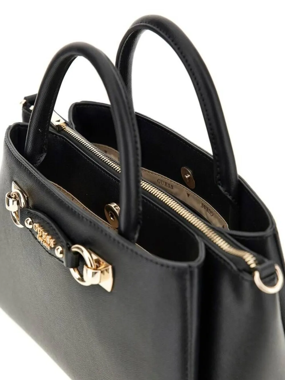 Klassisen tyylikäs keinonahkapintainen laukku kahdella magneettikiinnitteisellä lokerolla, joiden välissä on vetoket…
