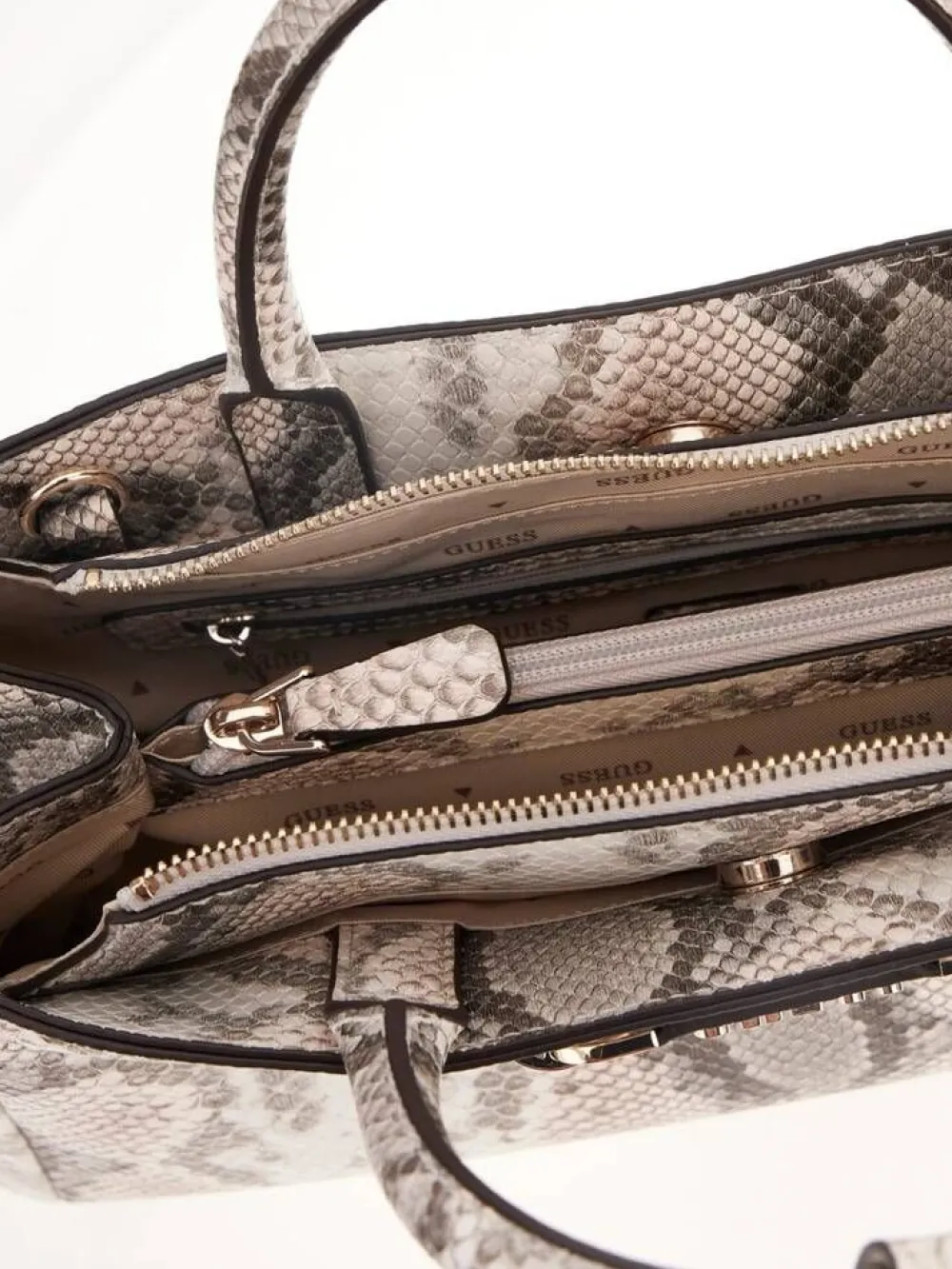 Trendikkäällä käärmekuosilla koristettu laukku. Synteettistä pintaa koristaa metalliset yksityiskohdat. Laukussa o…