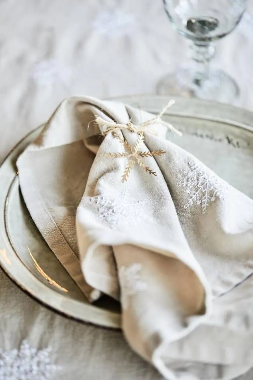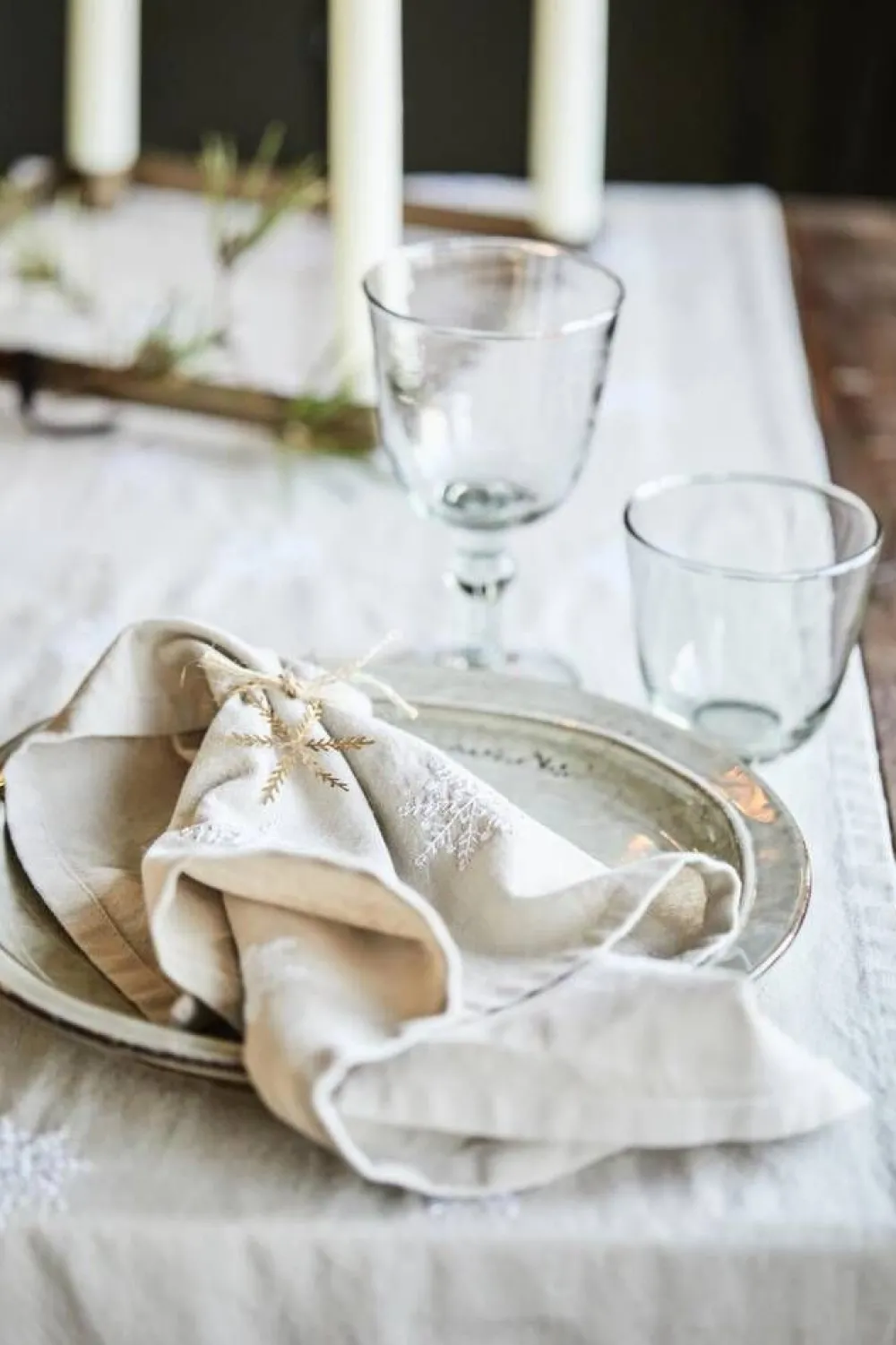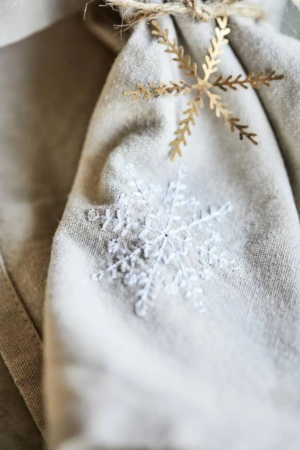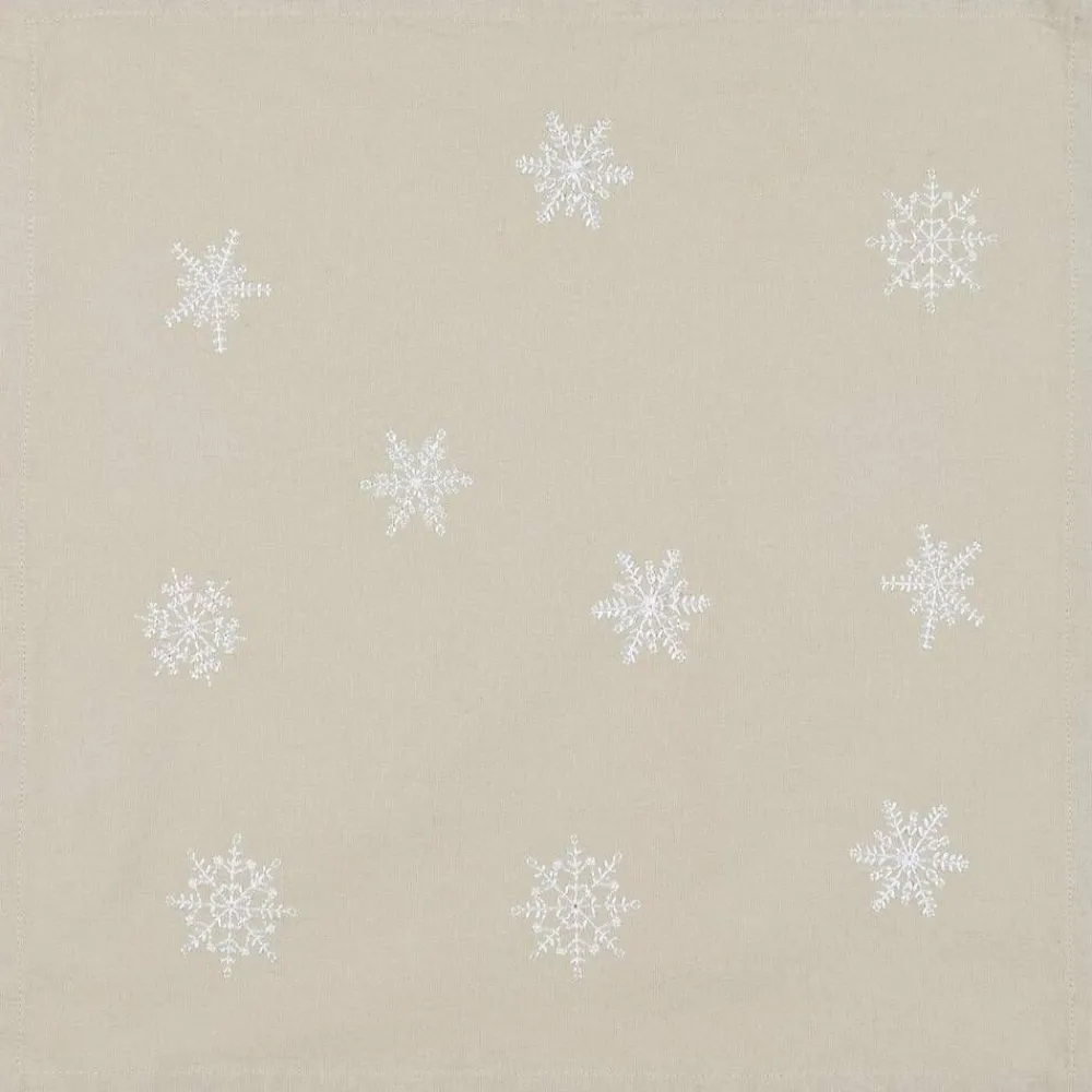 Kankainen lautasliina broderatuilla lumihiutaleillaLisää tietojaHoito-ohjeet:Pesu 40 asteessaMateriaali:KangasMitat:40…