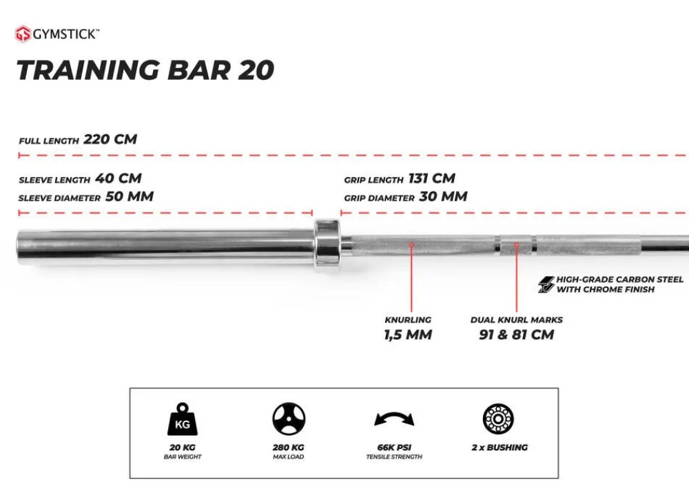 Gymstick Training Bar 20 kg levytankoon sopivat 50 mm levypainot. Painonnostotangon otesijat on karhennettu pidon parant…