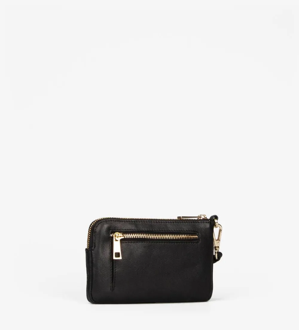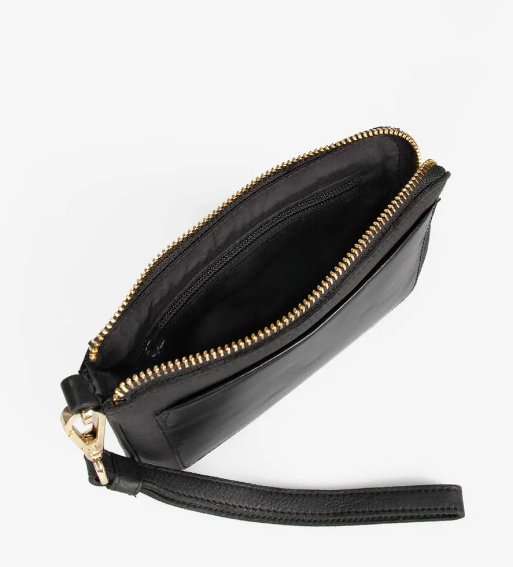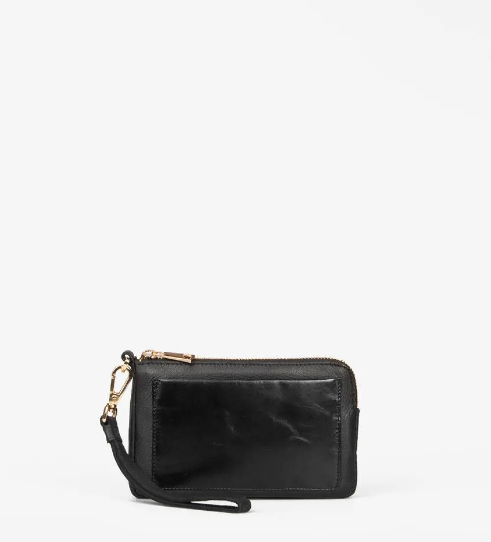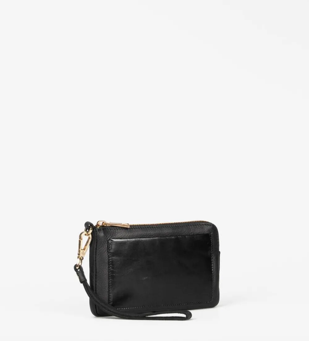 Pieni lompakkolaukku irrotettavalla rannelenkillä ja vetoketjukiinnityksellä. Etupuolella on kiiltävänahkainen tasku…
