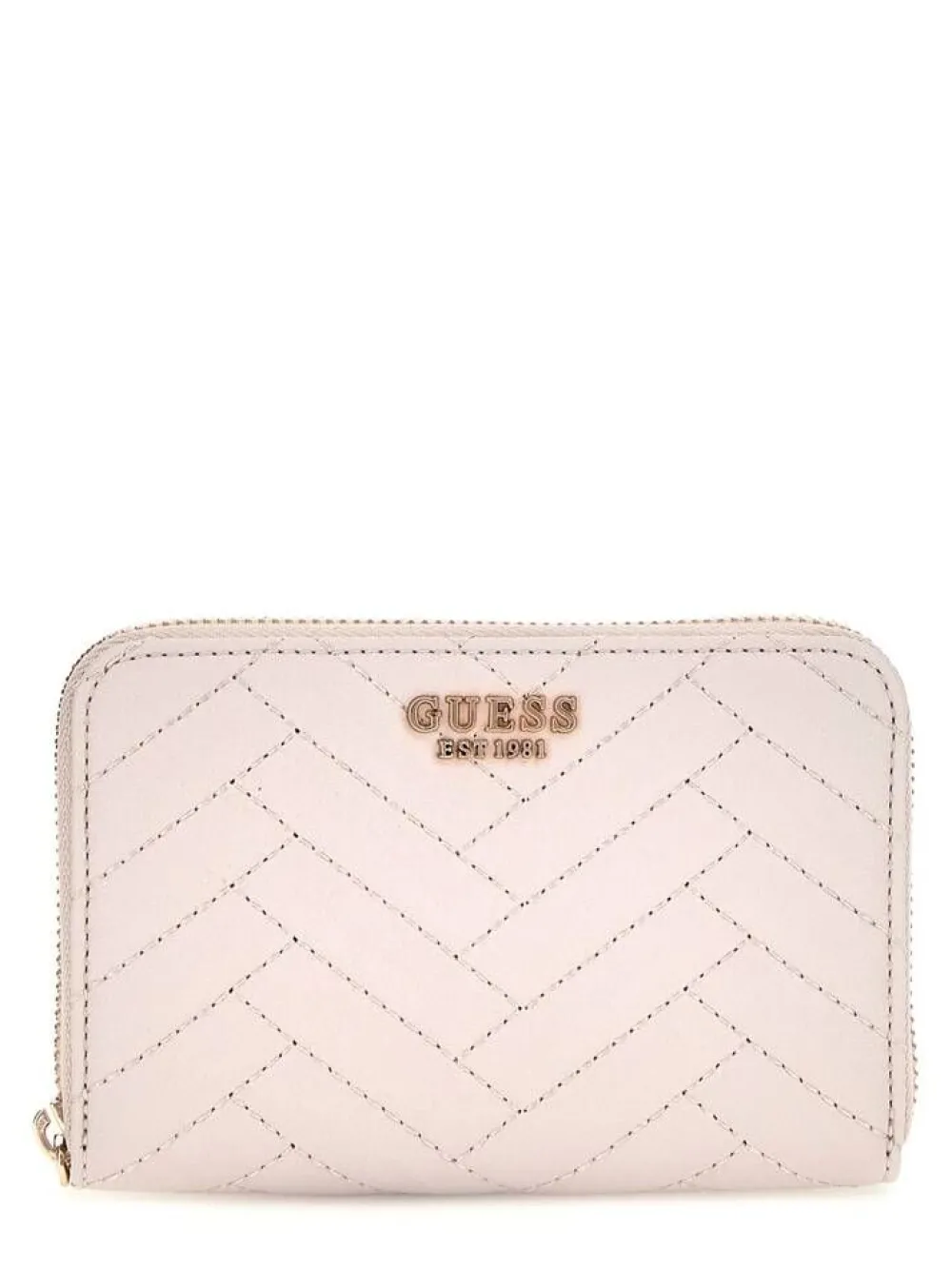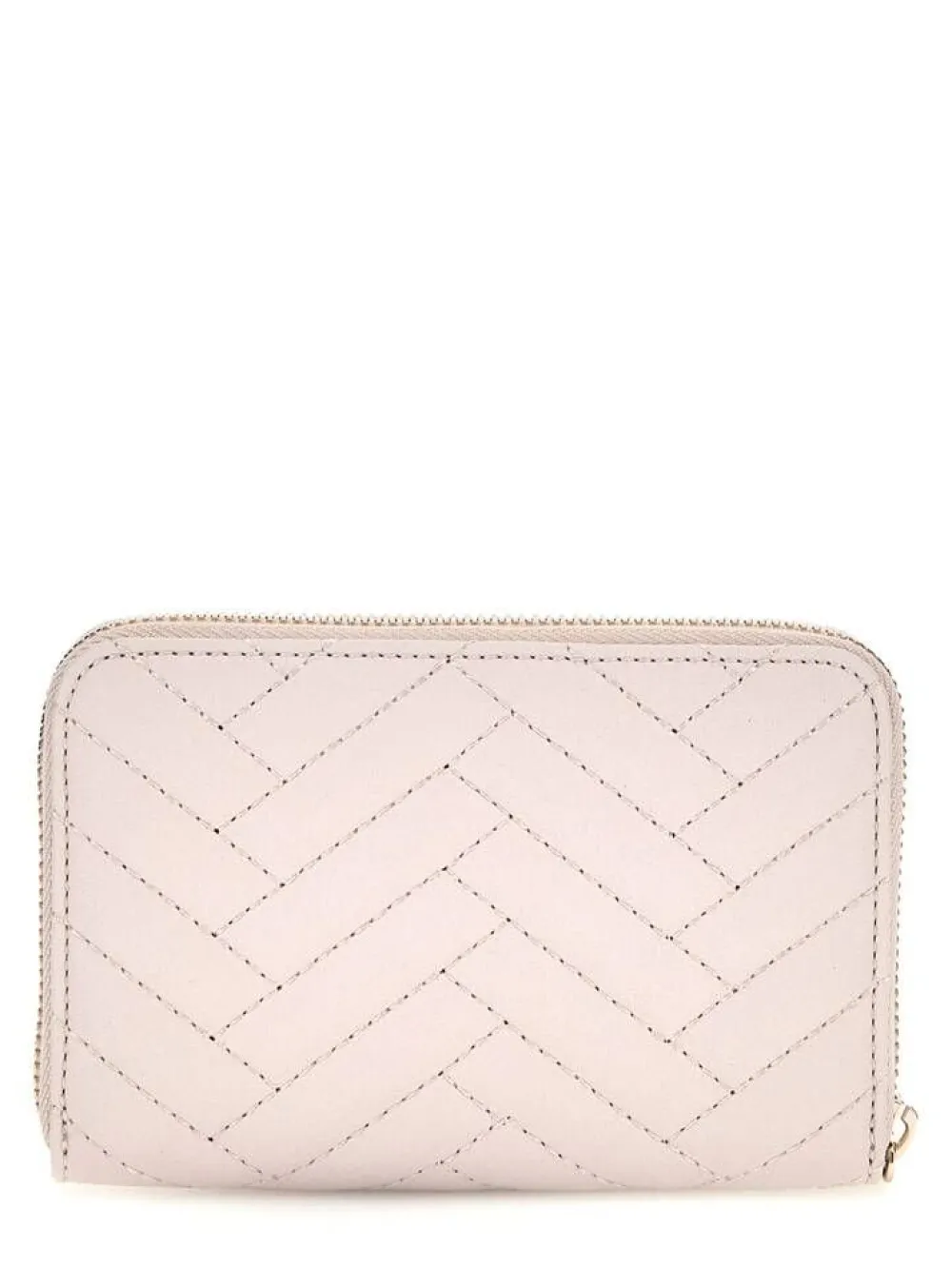 Ajaton vaalea vetoketjullinen lompakko kuviollisella tikkipinnalla ja etupuolen Guess-kirjanlogolla. Lompakon sisäpuole…