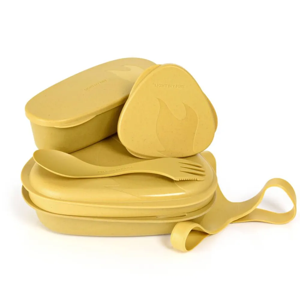 | Lautasen, kannen ja kahden erikokoisen SnapBox BIO -rasian materiaalista 96 % on sokeriruo’osta ja puukuidusta valmistettua biopohjaista muovia, joka on Bonsucro, ISCC ja PEFC sertifioitu. Spork Original BIO materiaalista 15 % on maissista valmistettua GMO-vapaata biopohjaista muovia. Valjaan materiaali Dryflex Green TPE, jonka materiaalista 23 % on sokeriruo’osta valmistettua biopohjaista muovia. 100 % BPA-vapaa. |
