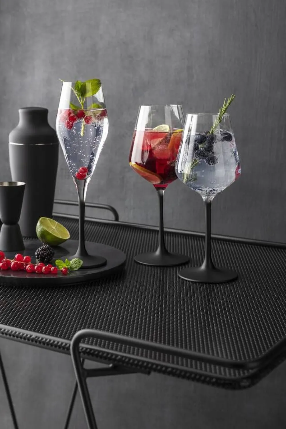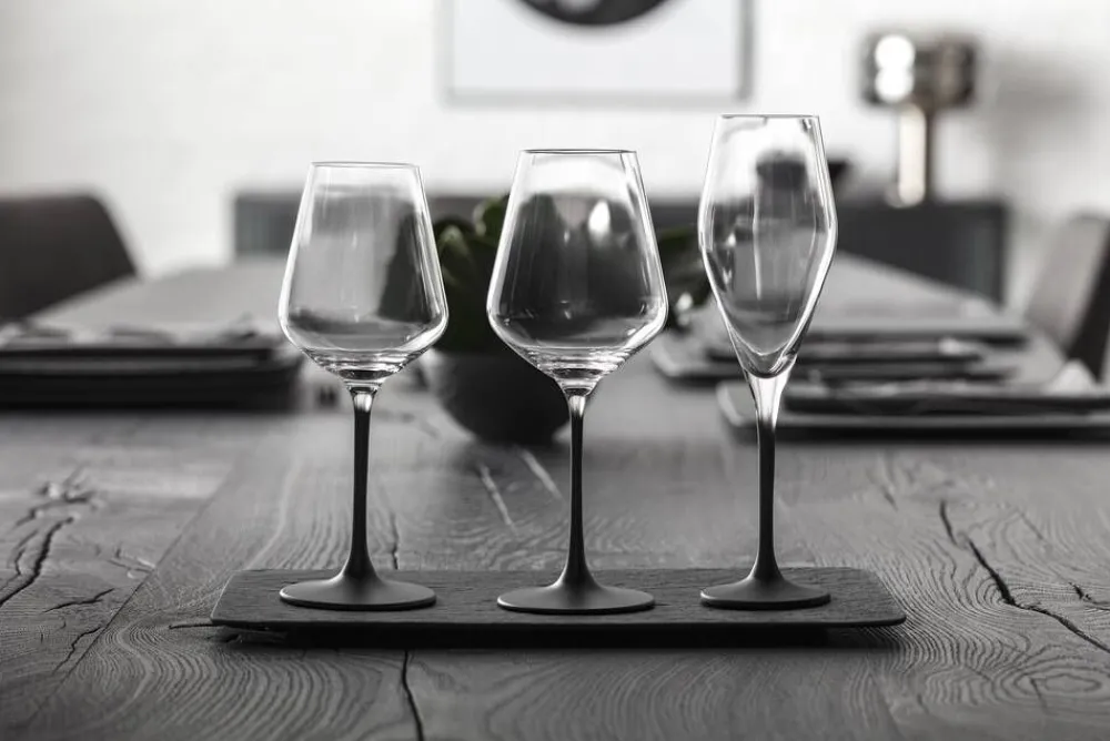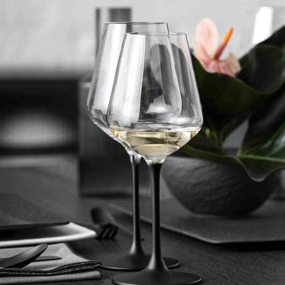 Mattamustalla jalalla olevat valkoviinilasit sopivat yhteen Manufacture Rock astioiden kanssa luoden harmonisen kokonais…