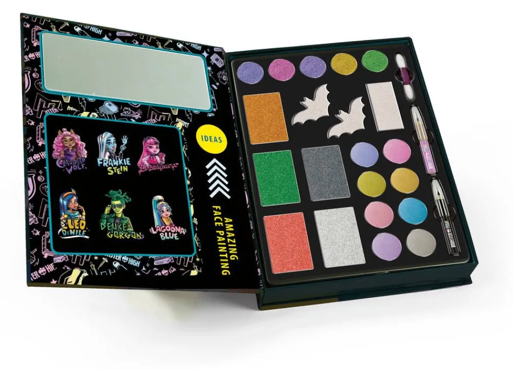 Monster High -meikkisetti sisältää yhteensä 18 väriä (joista 5 kimaltelevaa) luomille ja kasvoille, lilan ja musta…