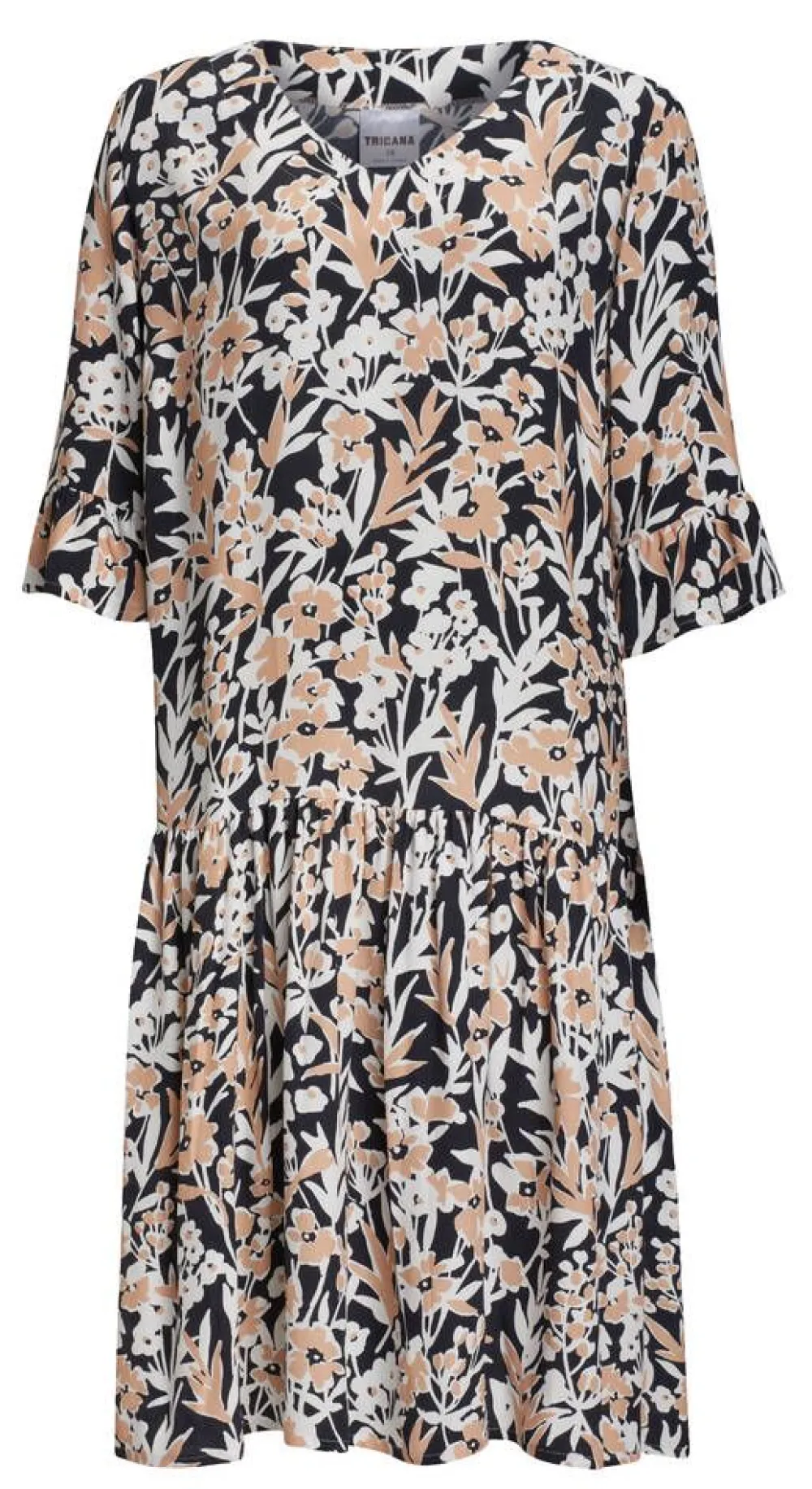 Naisten kukallinen mekko rypytetyllä helmasaumalla ja frilla-hihoilla.Lisää tietojaValmistettu SuomessaVäljä malliO…