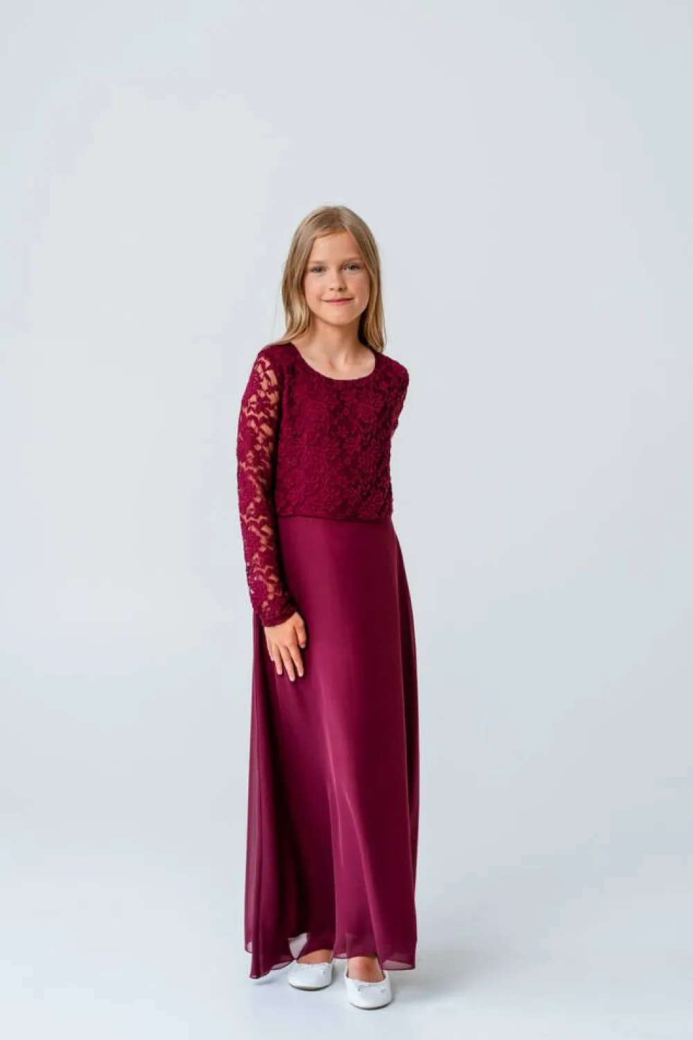 Upea maksimittainen mekko hienostuneella levenevällä sifonkihelmalla ja pitsisellä yläosalla. Pitkät hihat.Lisää …