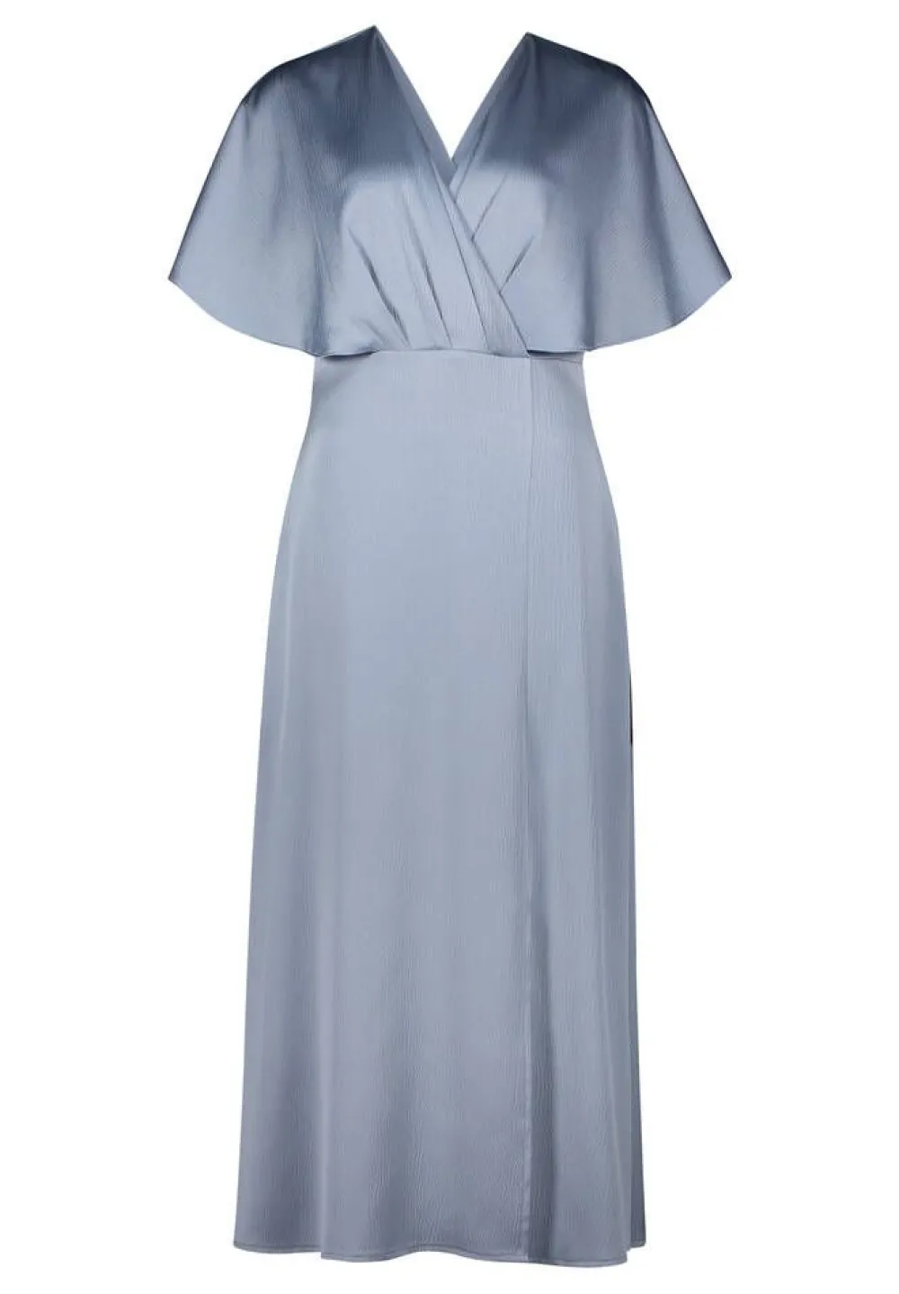 Elegantti nilkkapituinen satiinimekko kietaisumallisella yläosalla ja enkelihihoilla. Mekossa on vetoketjukiinnitys j…