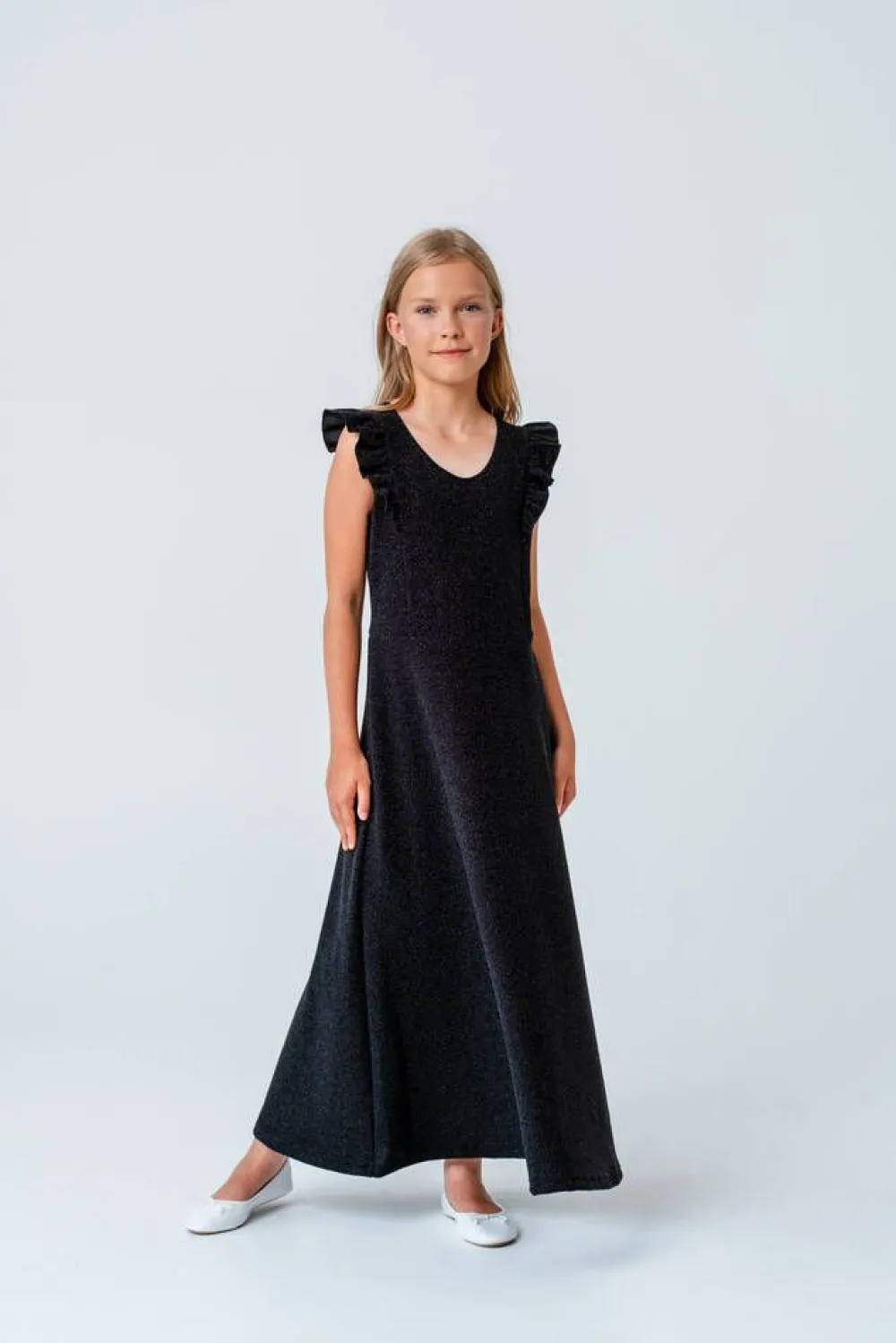 Upea maximittainen mekko joustavasta lurex-kankaasta. Levenevä helma ja hienostuneet frillat olkapäillä.Lisää tieto…