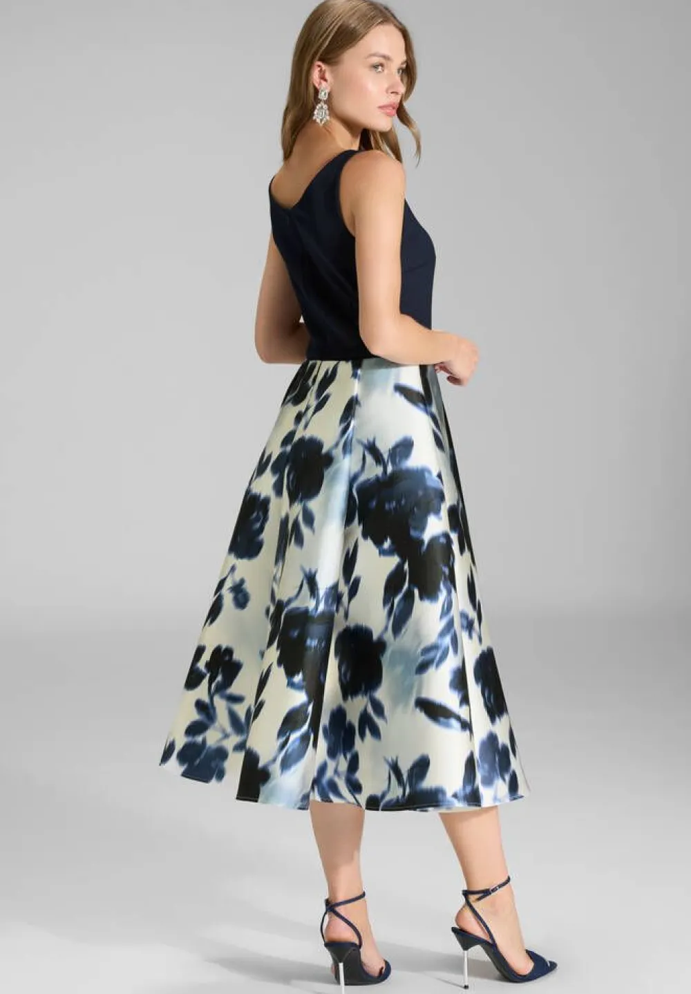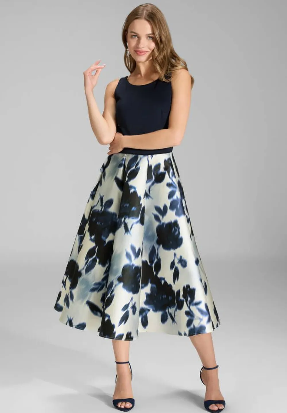 Klassisen kaunis hihaton cocktail-mekko leveällä kuosillisella helmalla. Yksivärinen yläosa on scuba-kangasta. Selä…