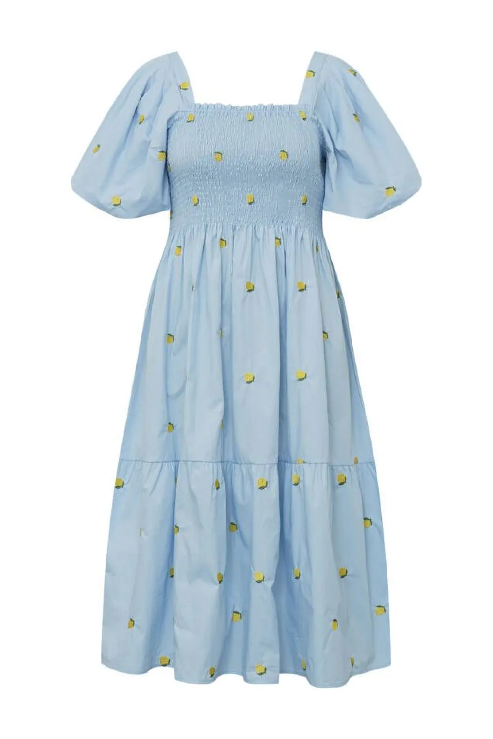 Trendikäs kesäinen puuvillamekko romanttisella muotoilulla. Imarteleva smokkirypytetty yläosa, jota tasapainottaa nä…