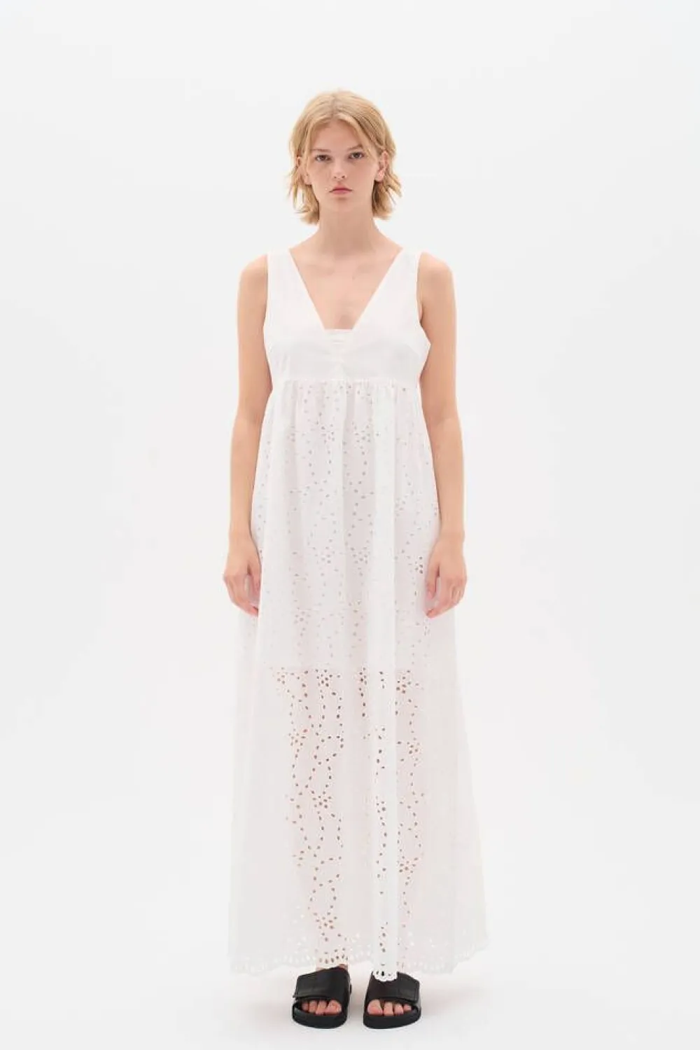 Romanttinen kokovalkoinen hihaton puuvillapitsimekko. Takana vetoketjukiinnitys ja sivuilla kätevät taskut.Lisää tie…