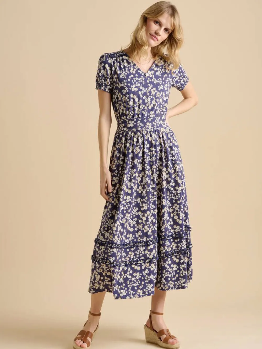 Ajattoman kaunis pitkä kukallinen mekko romanttisella vivahteella. Leveä vyötärökaistale ja lyhyet puhvimaiset hiha…