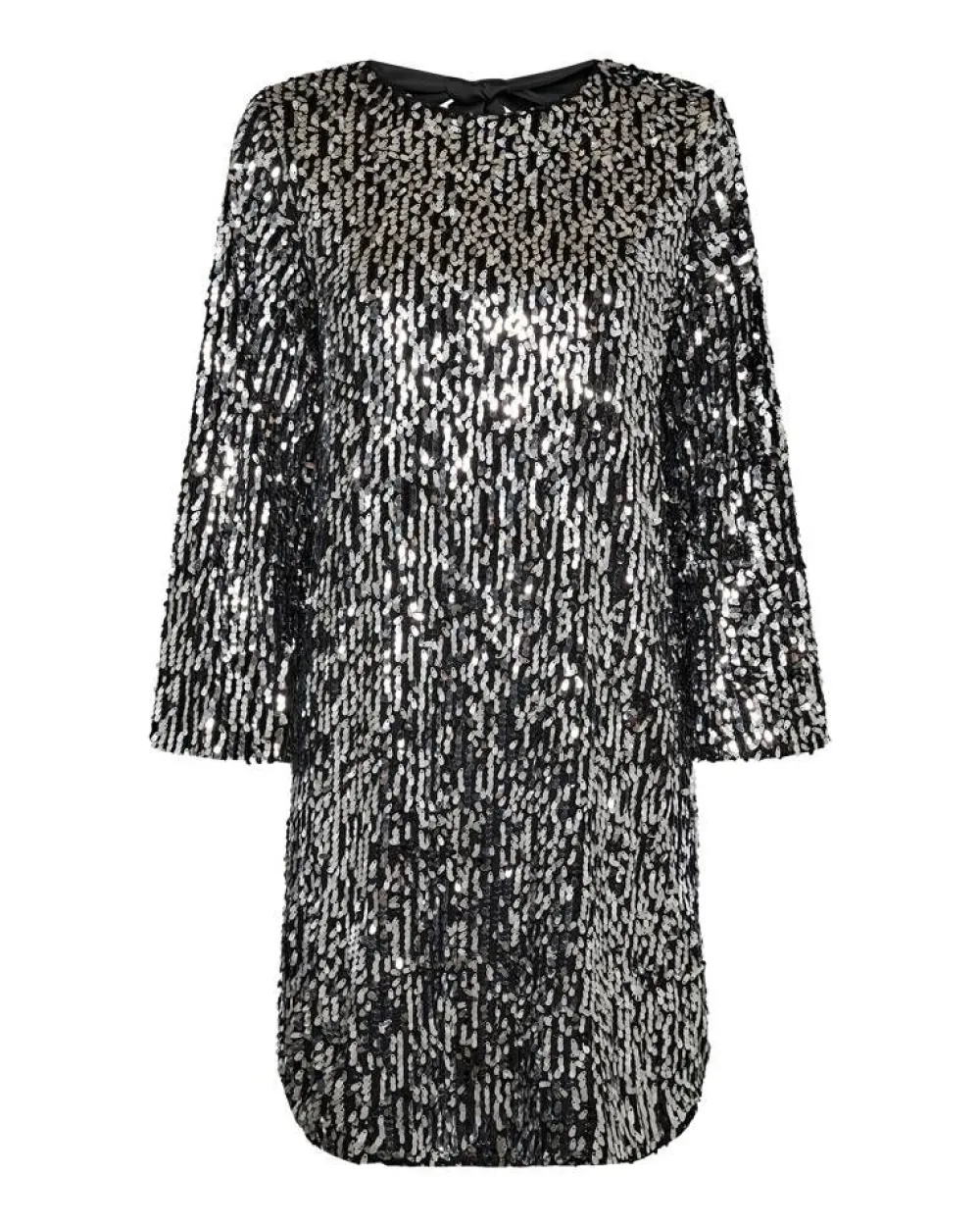 Näyttävä juhlakauden säihkyvä mekko paljettipinnalla. Niskassa on trendikkäät solmittavat satiininauhat.Lisää t…