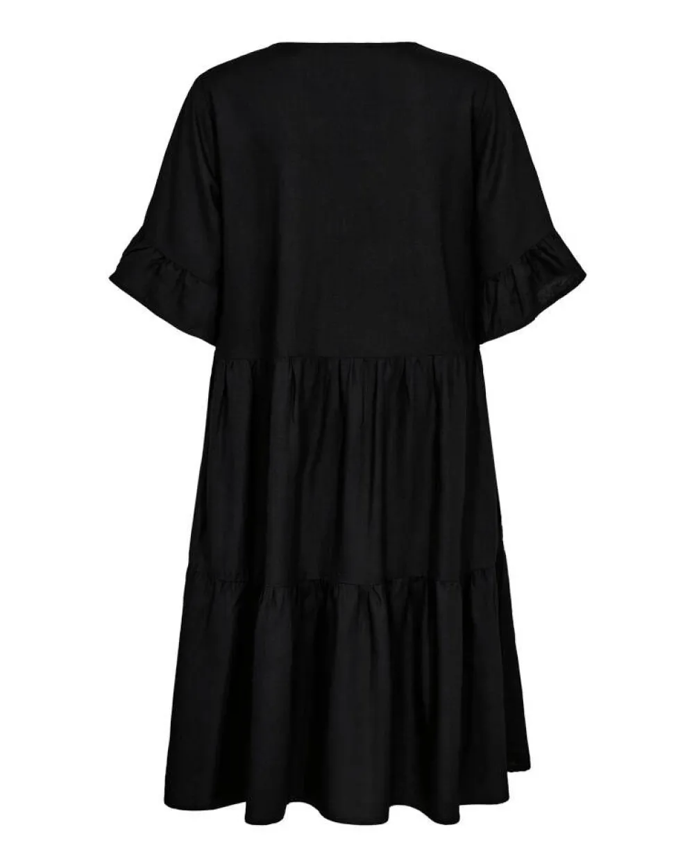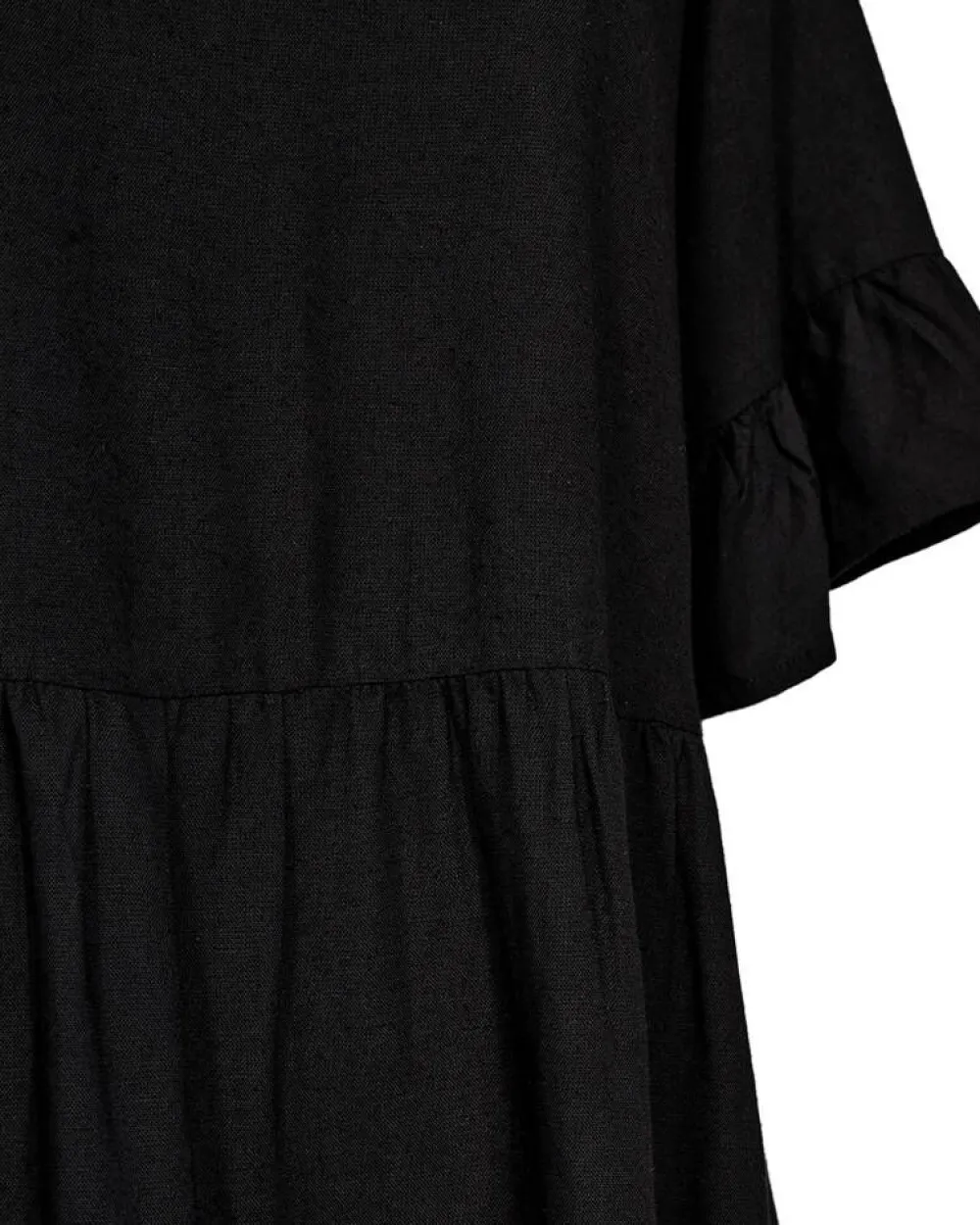 Ihanan kevyt röyhelömekko väljällä istuvuudella ja lyhyillä hihoilla. Helma laskeutuu A-linjaisesti.Lisää tietoj…