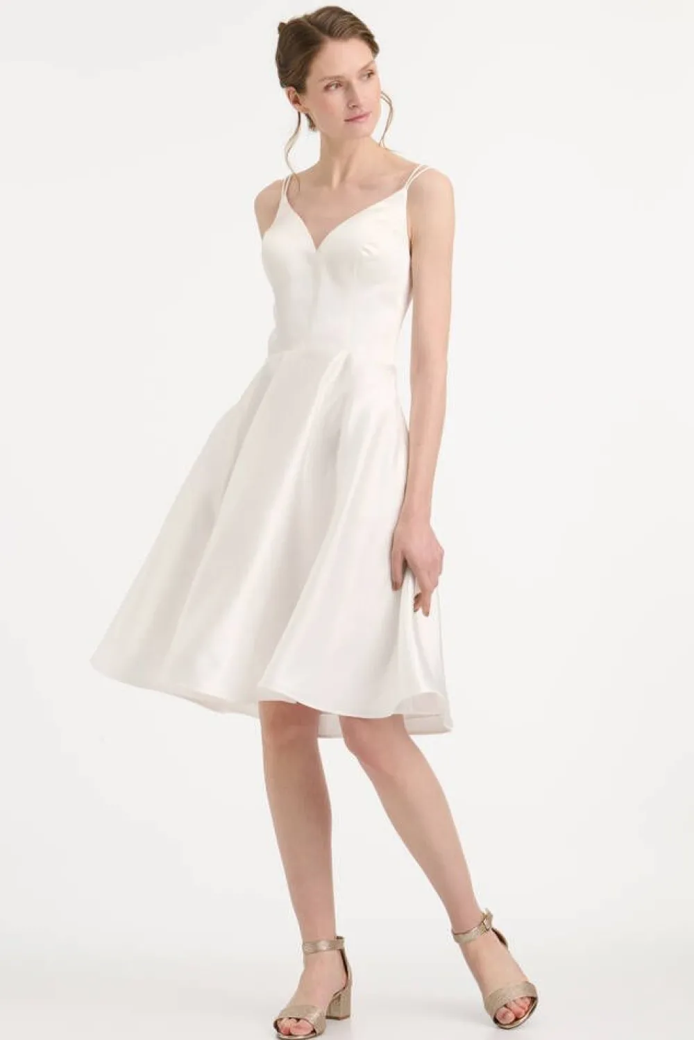 Juhlava midimittainen satiinimekko v-pääntiellä ja avoimella selkäpuolen nyörityksellä. Sivuilla kätevät huomaam…