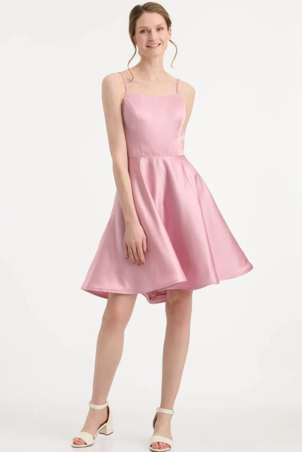 Näyttävä satiininen juhlamekko suoralla pääntiellä ja avoimella nyöritetyllä selkäpuolella. Mekossa kapeat olka…
