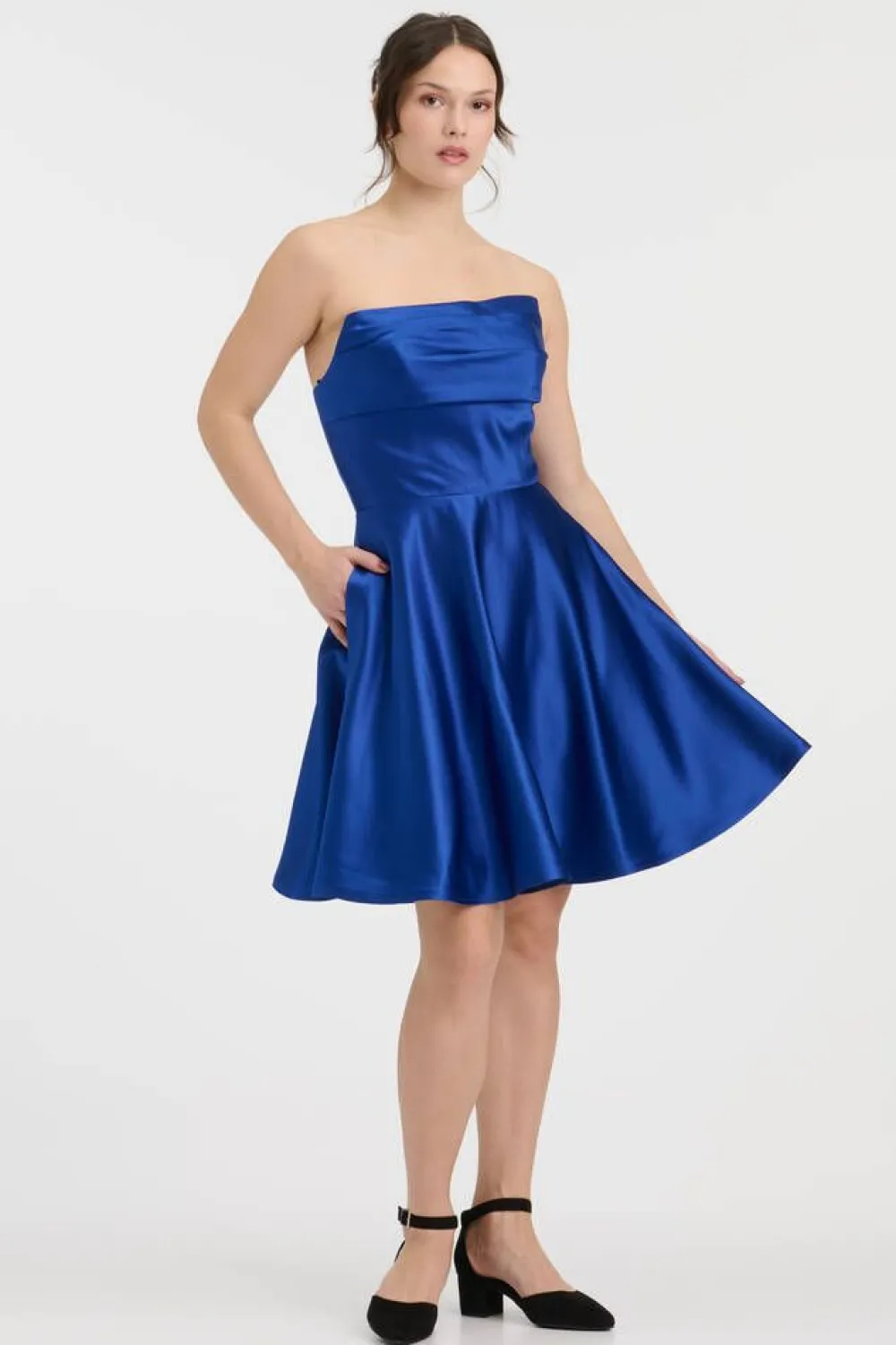 Kaunis koboltinsinen olkaimeton ja kellohameinen satiininen juhlamekko. Takana vetoketjukiinnitys ja ohut nyöritys. Hel…