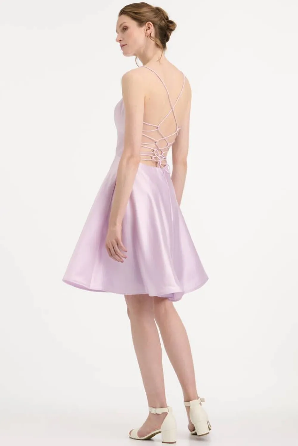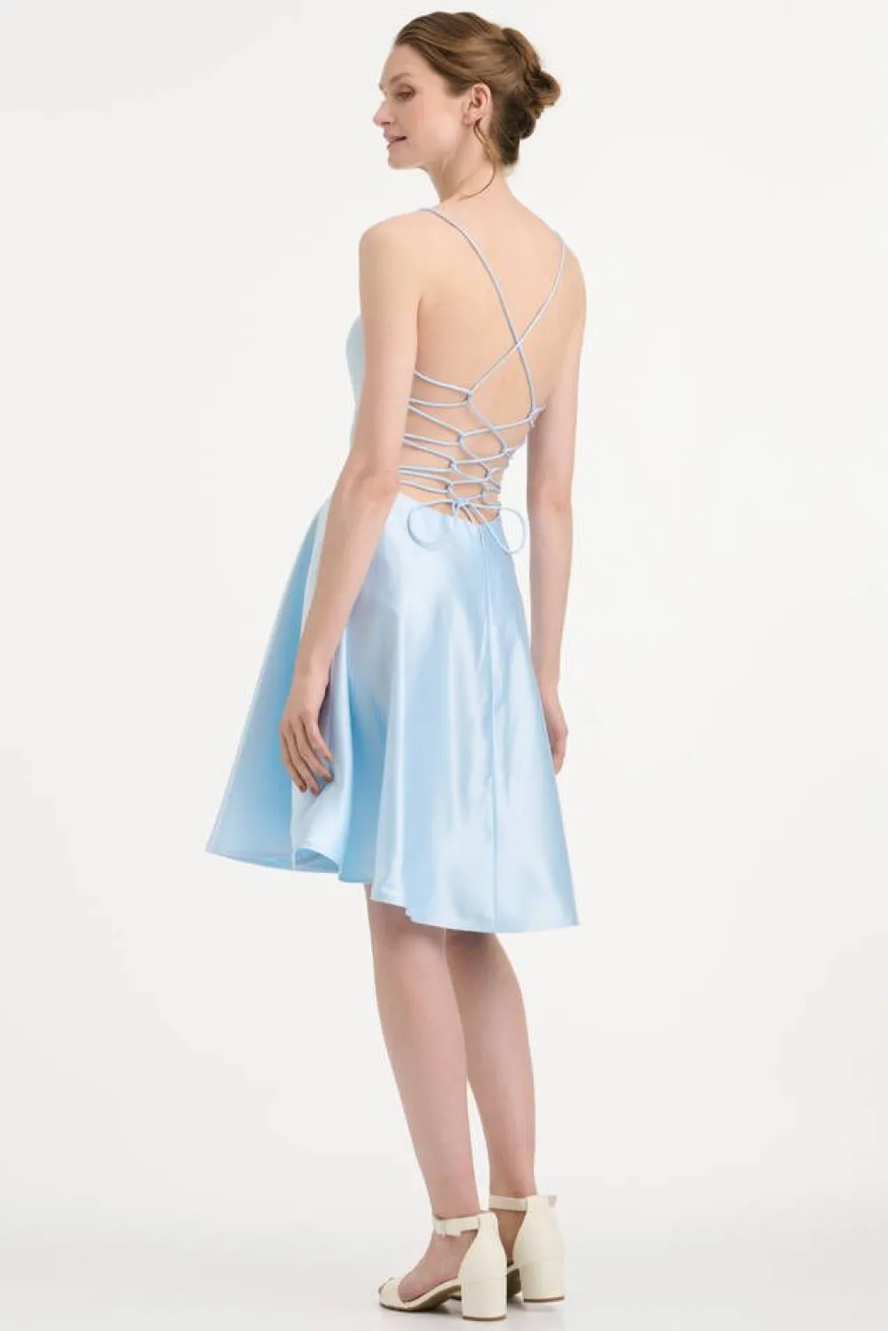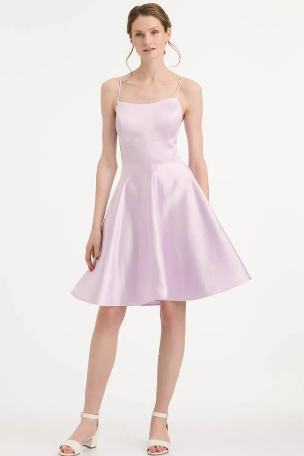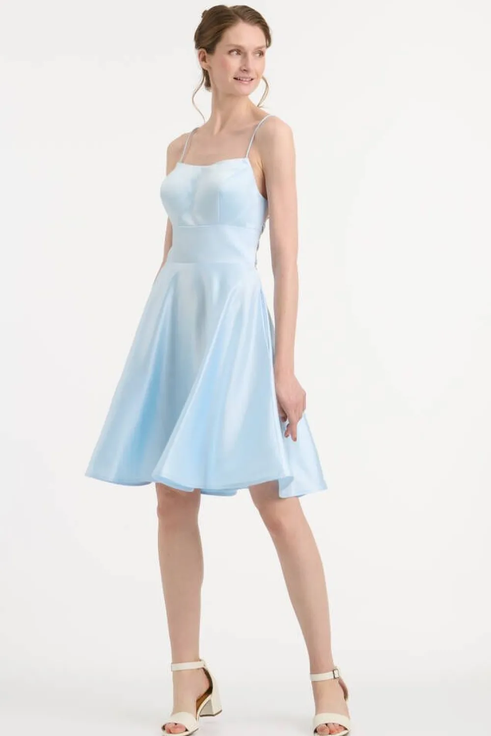 Upea kellohelmainen satiinimekko suoralla pääntiellä ja kokonaan avoimella nyöritetyllä selkäpuolella. Helman sivu…
