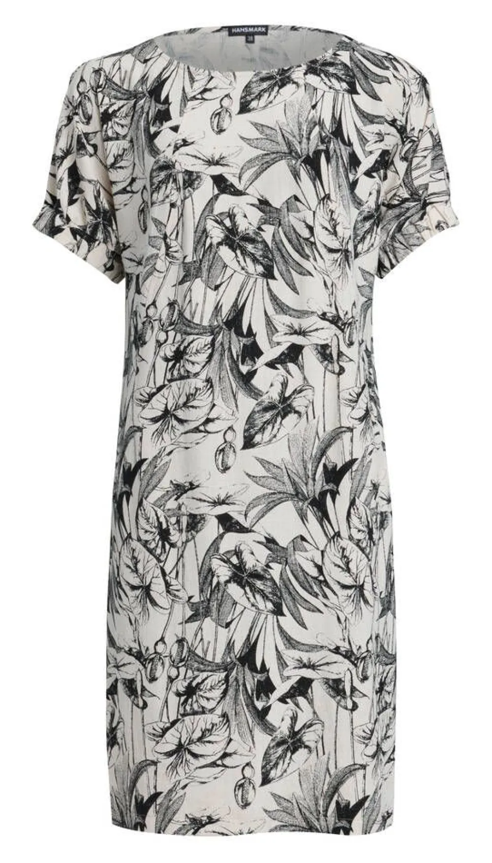 Väljä pellavasekoitteinen mekko lyhyillä hihoilla ja mustalla lehtikuosilla. Etupuolen koristesaumoihin on piilotettu…
