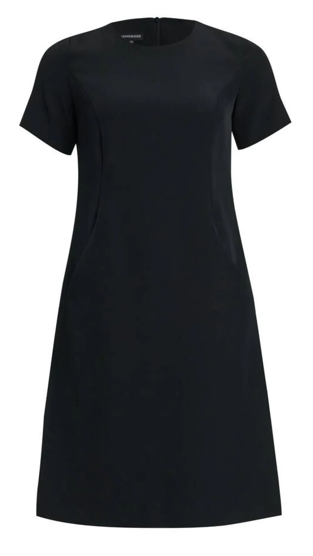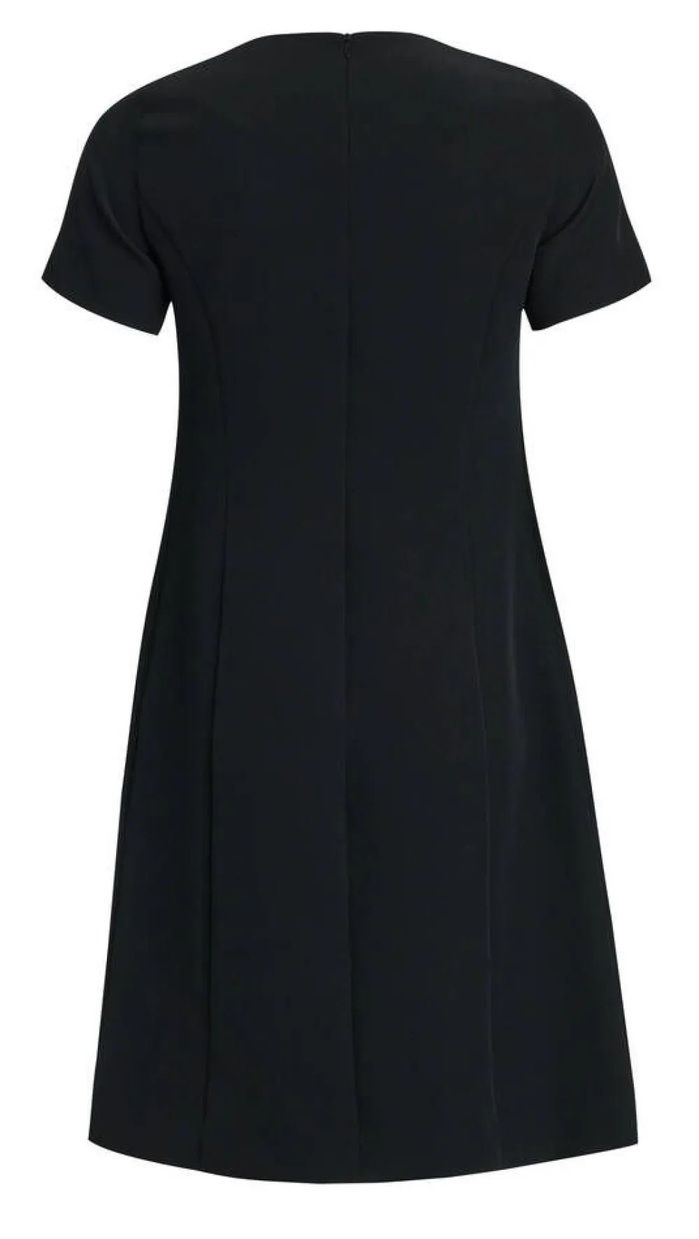 Monikäyttöinen ja ajaton musta mekko lyhyillä hihoilla. Mekon etupuolen koristesaumoihin on piilotettu kätevät avot…