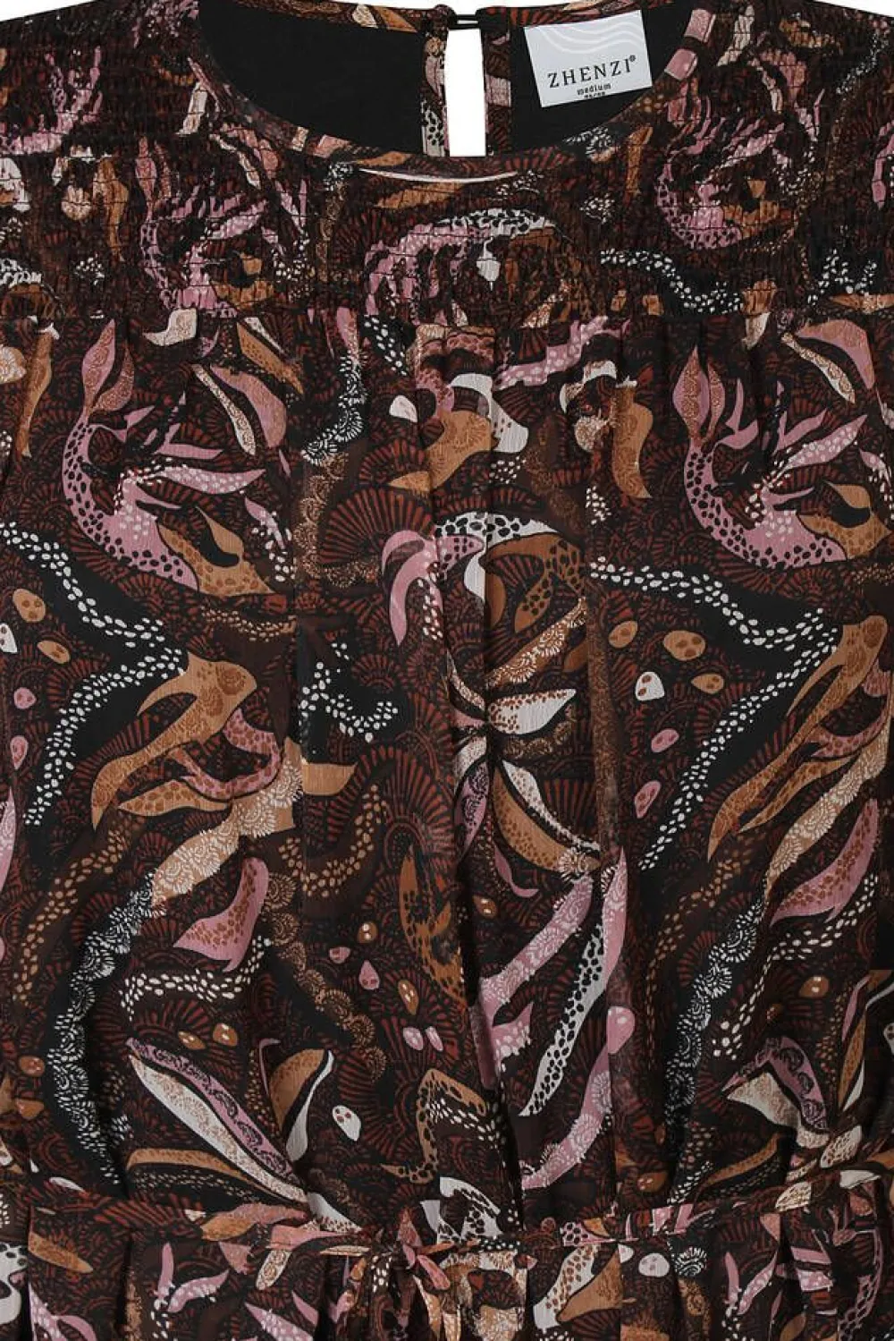 Kaunis kuosillinen sifonkitunikamekko rypytyksellä koristellulla yläosalla. Suora malli. Niskassa nappikiinnitys.Lisä…