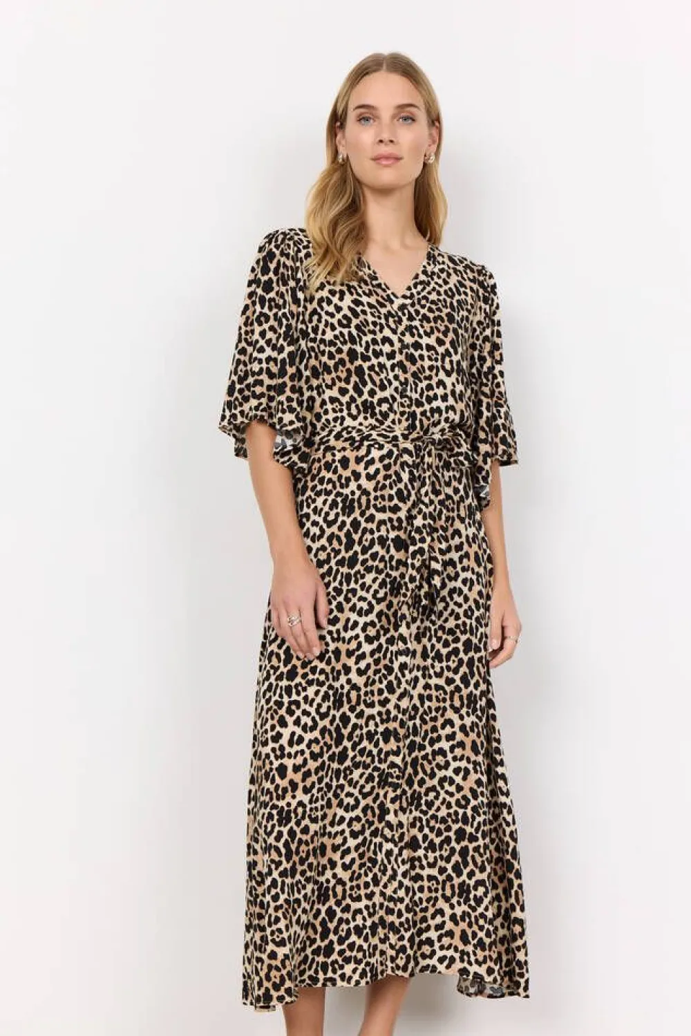 Trendikäs eläinkuosinen mekko, jonka helma ylettyy melkein nilkkoihin asti. Edessä on napit ja mekossa on kauniit lyh…