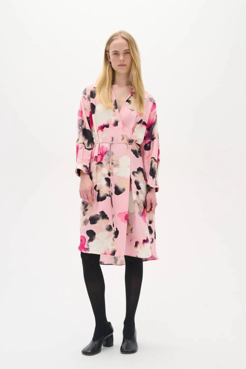 Hempeä kukkamainen kietaisumekko väljällä istuvuudella. Mekossa on kaulukset ja ohut kangasvyö, jolla mekon saa kie…