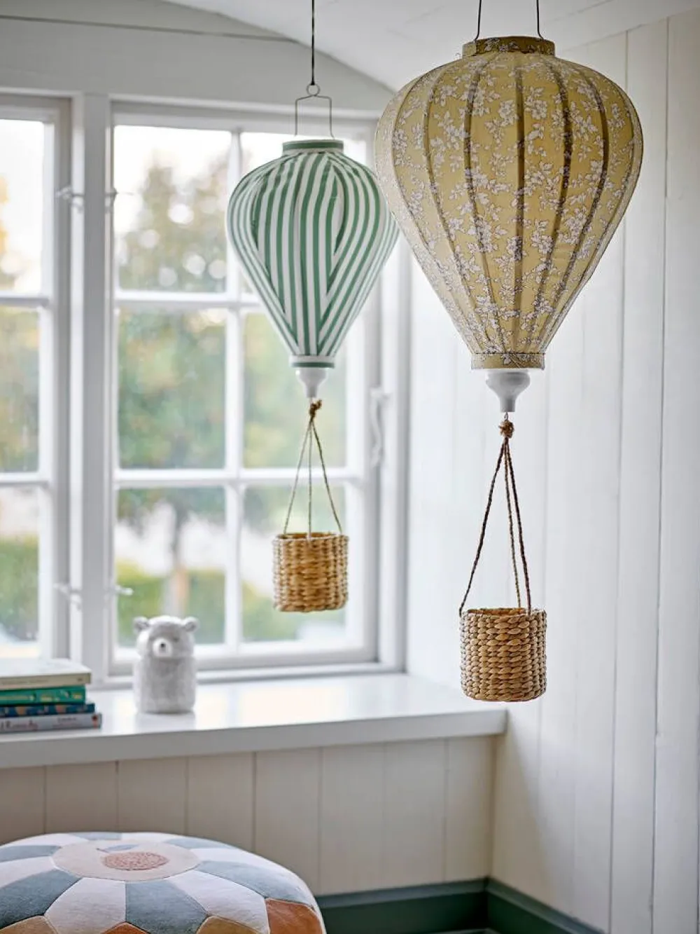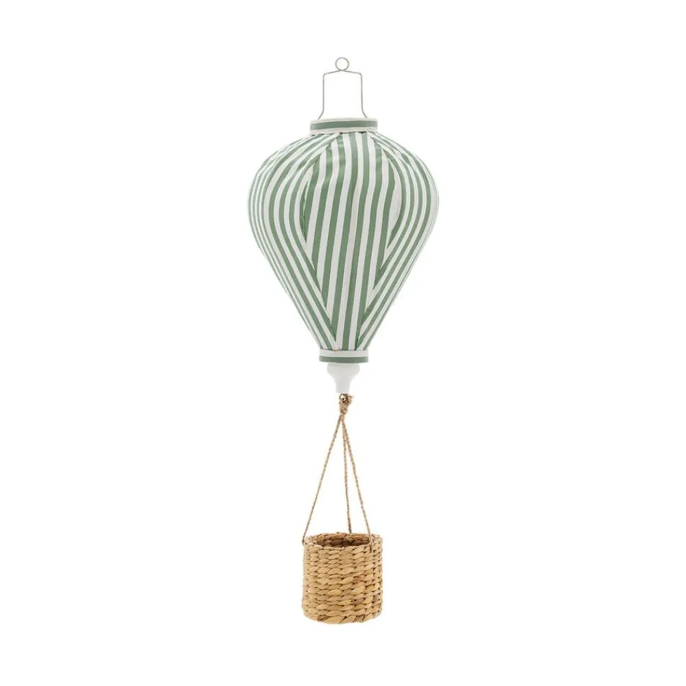 Pomp-mobiili on ihastuttava kuumailmapallo, joka sopii koristeeksi lastenhuoneeseen. Pallon vihreät raidat ja rottinkik…