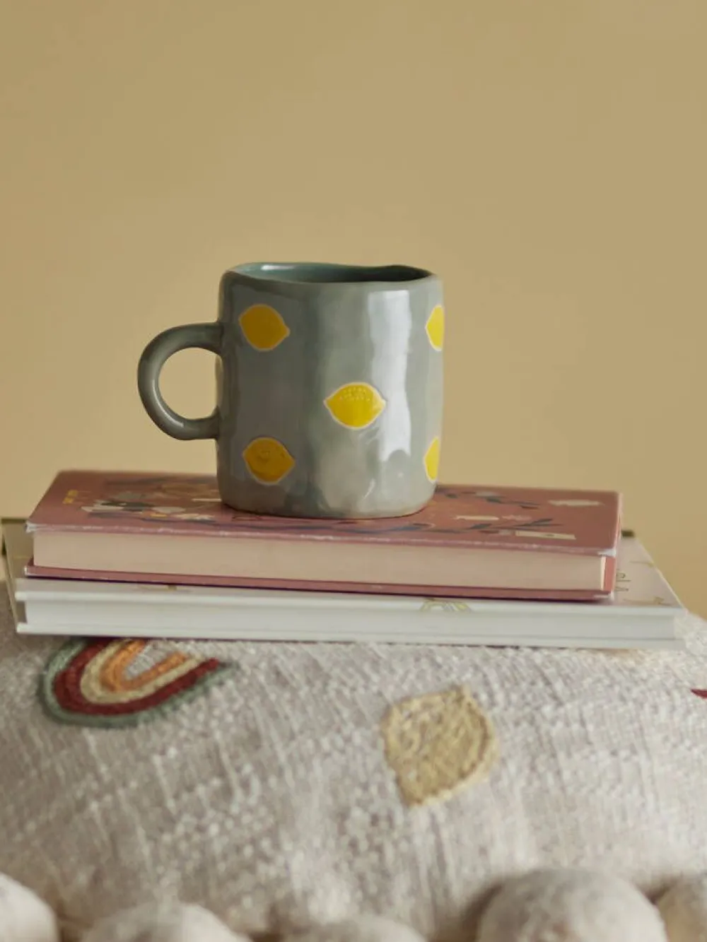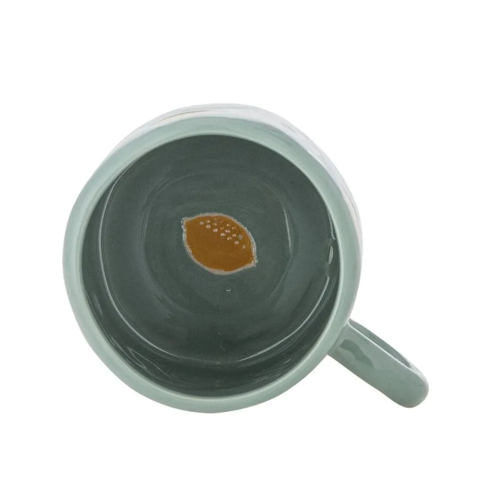 Agnes-muki on pieni, käsintehty muki sitruunakuvioilla. Kivitavarasta valmistettu ja mattavihreällä lasitteella viime…