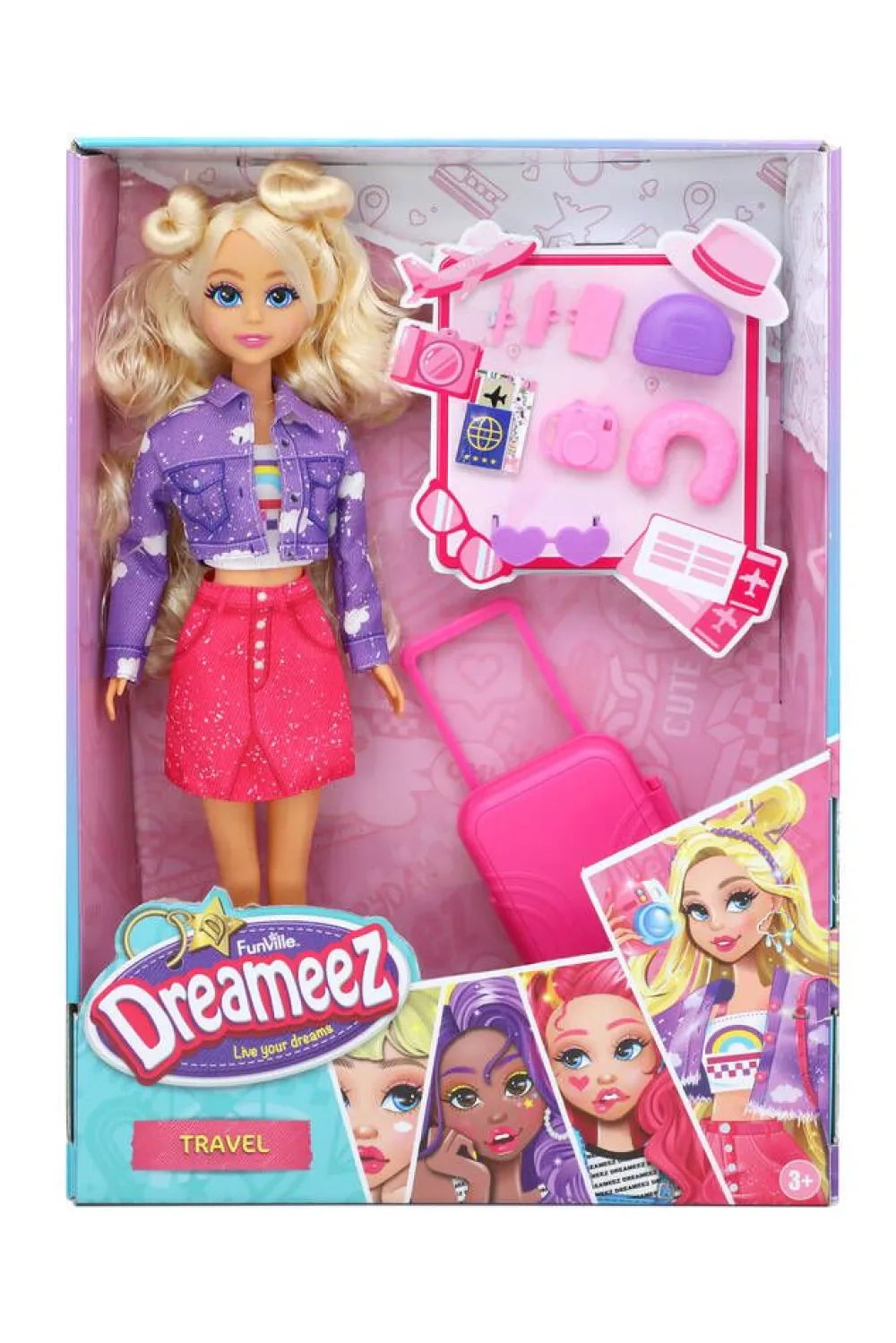 Dreameez-nukke nappaa matkalle mukaansa ainakin niskatyynyn ja kameran. Pakkaus sisältää nuken, matkalaukun ja tarvik…