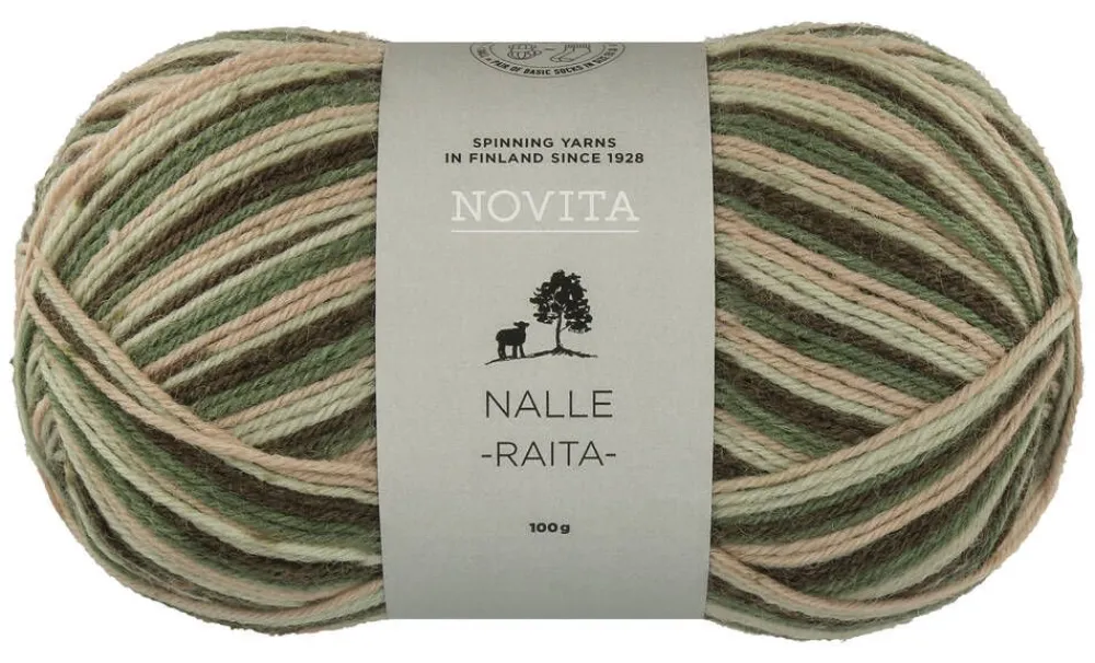 Nalle Raita -langasta saa koon 38 tasaraitasukat yhdestä kerästä. Koostumus on 80 % villaa ja 20 % polyamidia. Puikko…