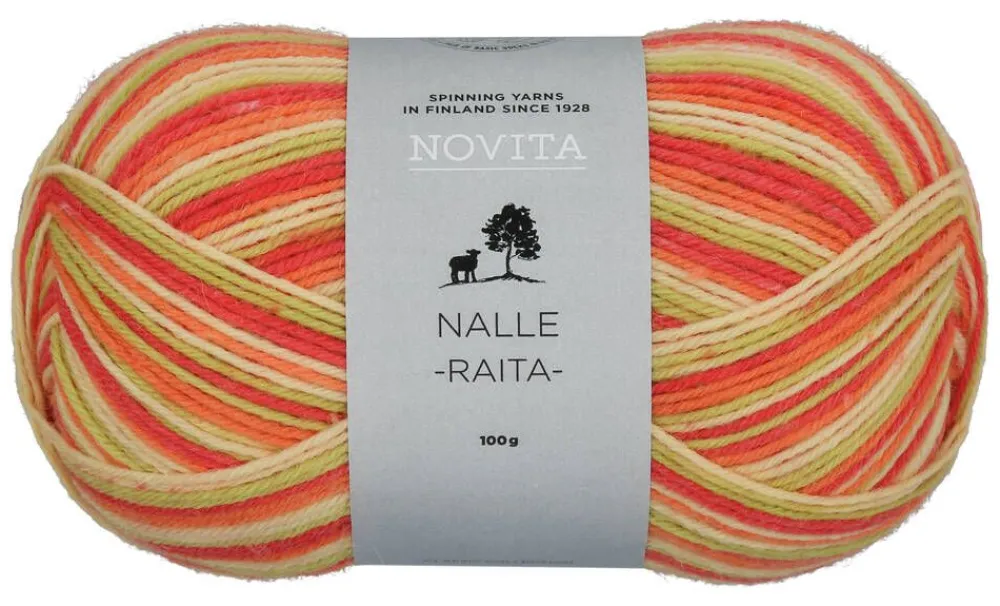 Nalle Raita -langasta saa koon 38 tasaraitasukat yhdestä kerästä. Koostumus on 80 % villaa ja 20 % polyamidia. Puikko…