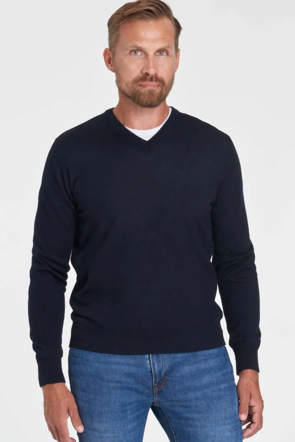 Miesten kevyt neule pitkillä hihoilla ja V-pääntiellä.Lisää tietojaMalli käyttää kokoa LMallin mitat: rinnanymp…