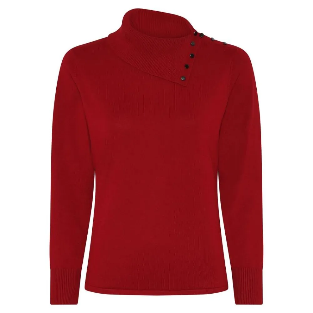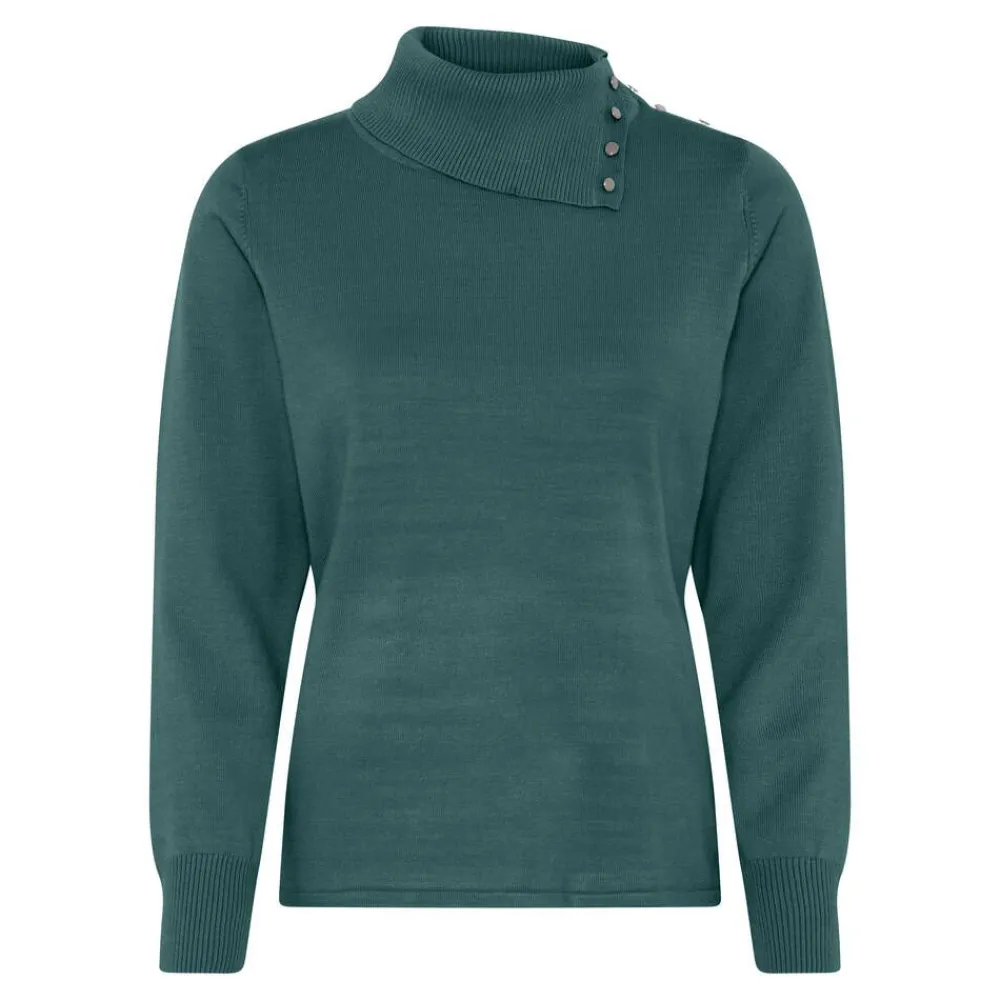 Tyylikäs yksivärinen neule, jossa on toiselta sivulta avoin poolokaulus näyttävillä koristenapeilla.Lisää tietoja…