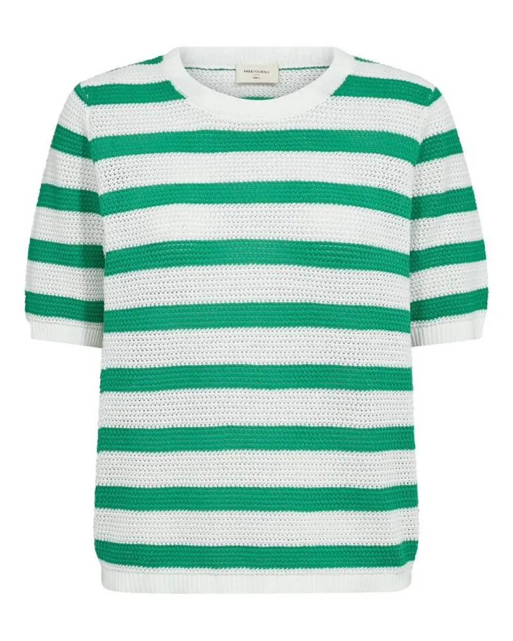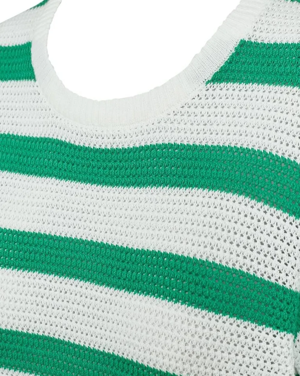 Lyhythihainen raitaneule, joka on valmistettu 100% luomupuuvillasta. Rennon tyylikäs ja mukava valinta arkeen.Lisää t…