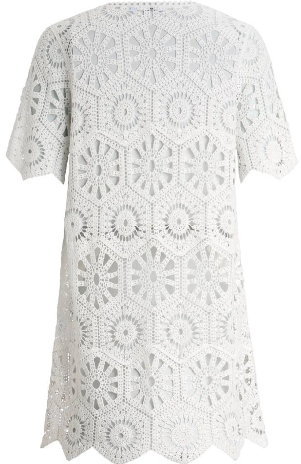 Kaunis pitkä ja avoin pitsineuletakki lyhyillä hihoilla. Edessä ohut kangasnyöri jolla neuletakin voi tarvittaessa s…