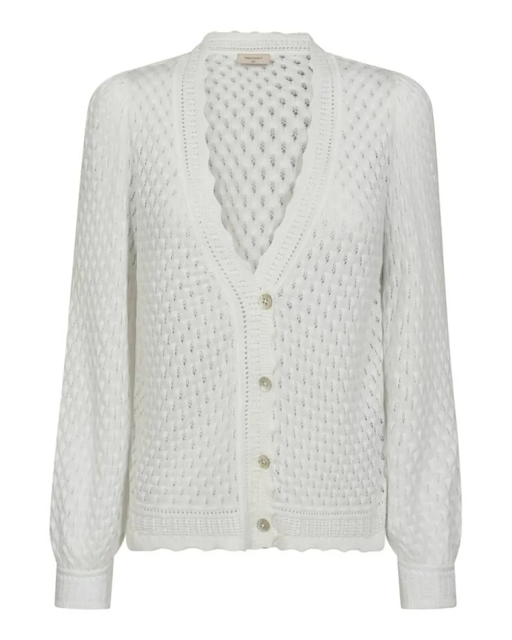 Naisellinen neuletakki pitsineulosta. Neuletakin pitkät puhvihihat ja helmikoristeiset napit luovat elegantin ilmeen. K…