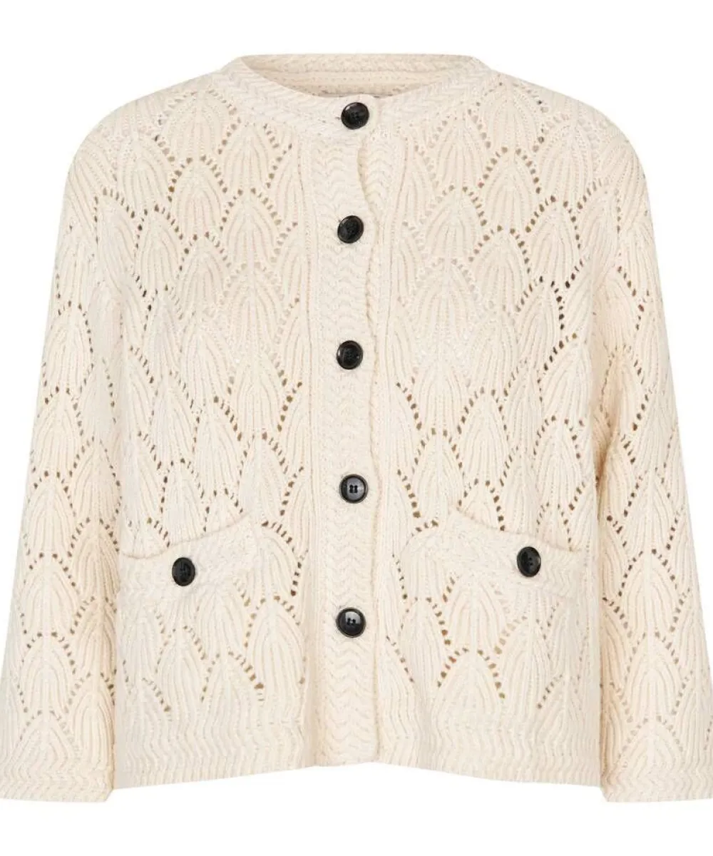 Ihastuttava lyhyt neuletakki kauniilla pitsipinnalla ja nappikiinnitteisillä taskuilla. Suora malli ja vajaamittaiset h…
