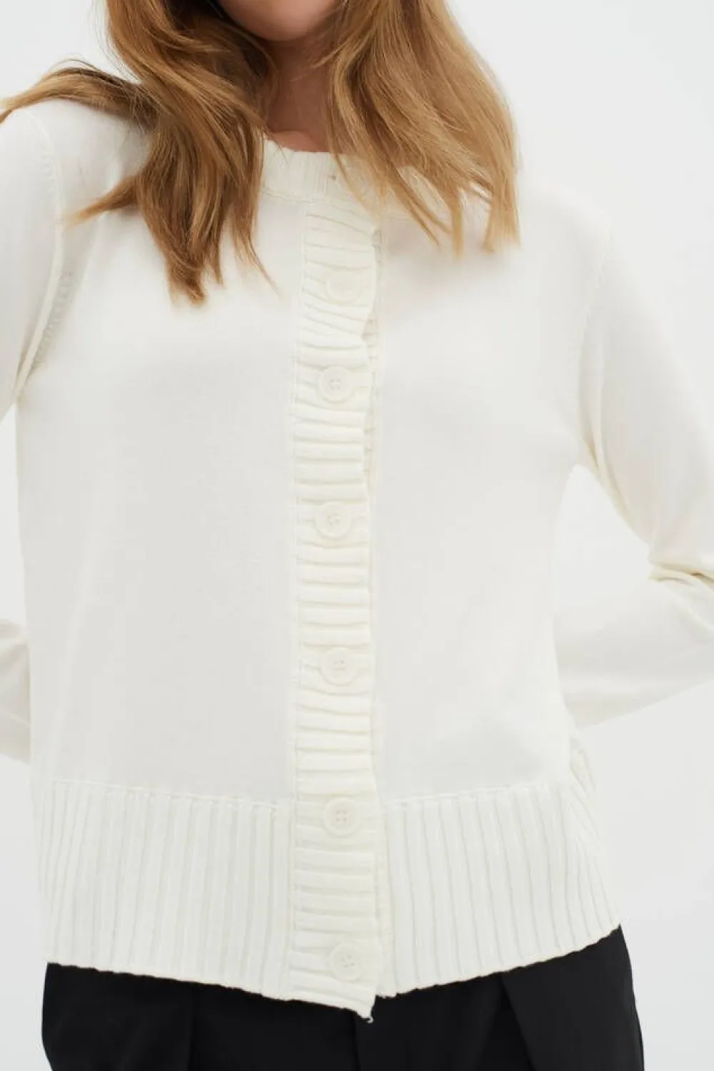Klassinen lyhyen mallinen neuletakki, jossa on edessä isot napit. Helmassa ja hihojen suissa on leveää joustinneulost…