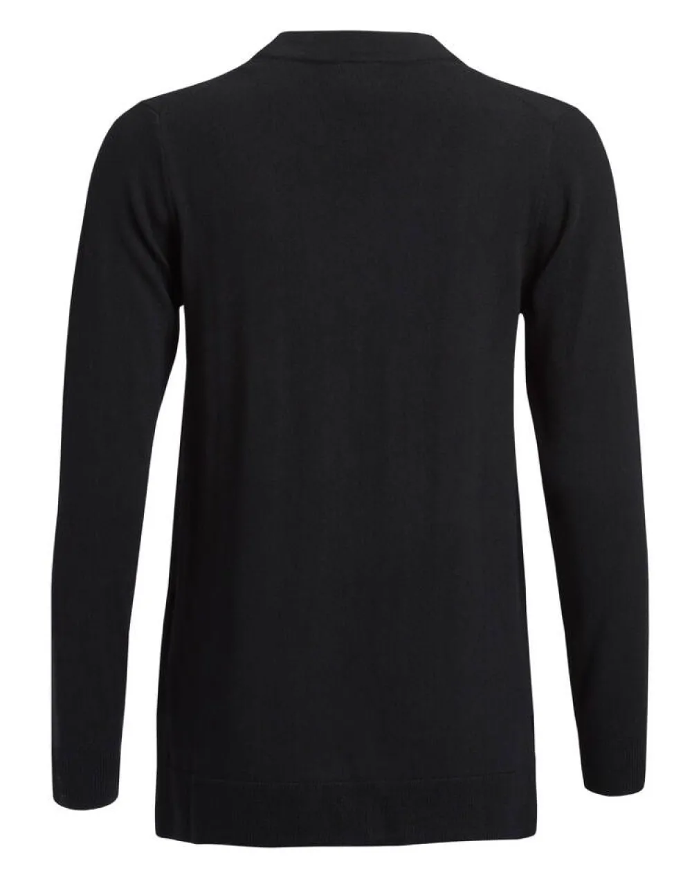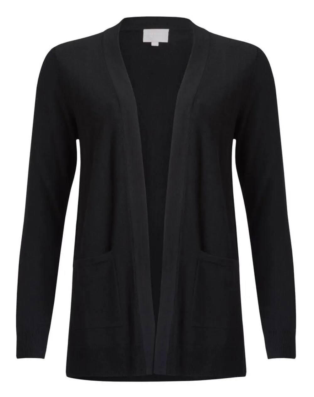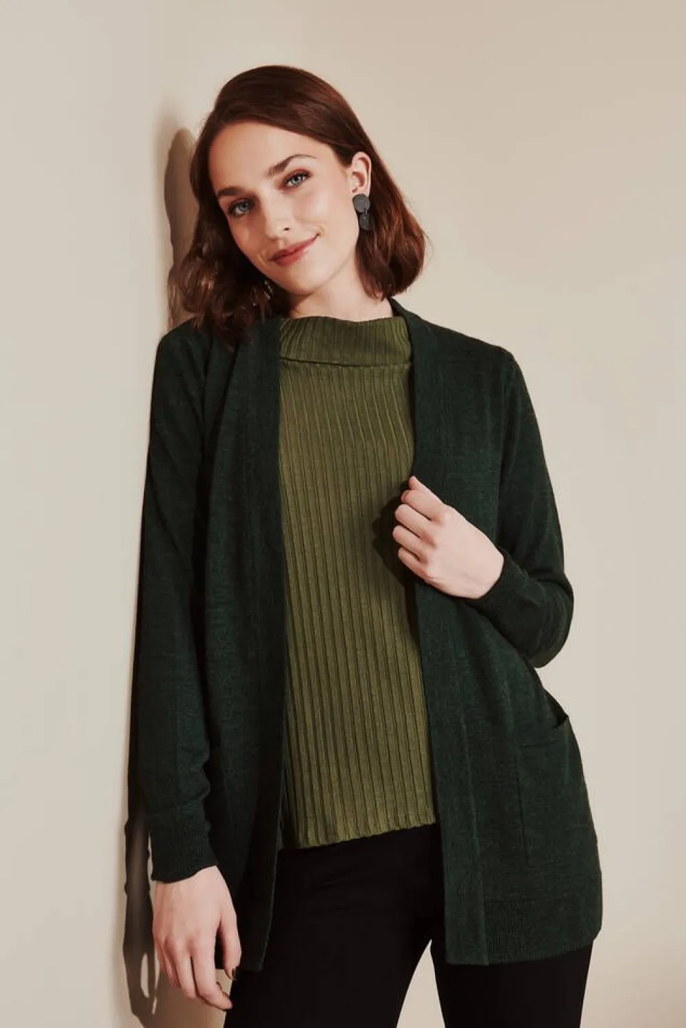 Lämmin merinovillainen neuletakki ilman etukiinnitystä. Pitkähihaisen neuletakin etupuolella on kätevät paikkatasku…